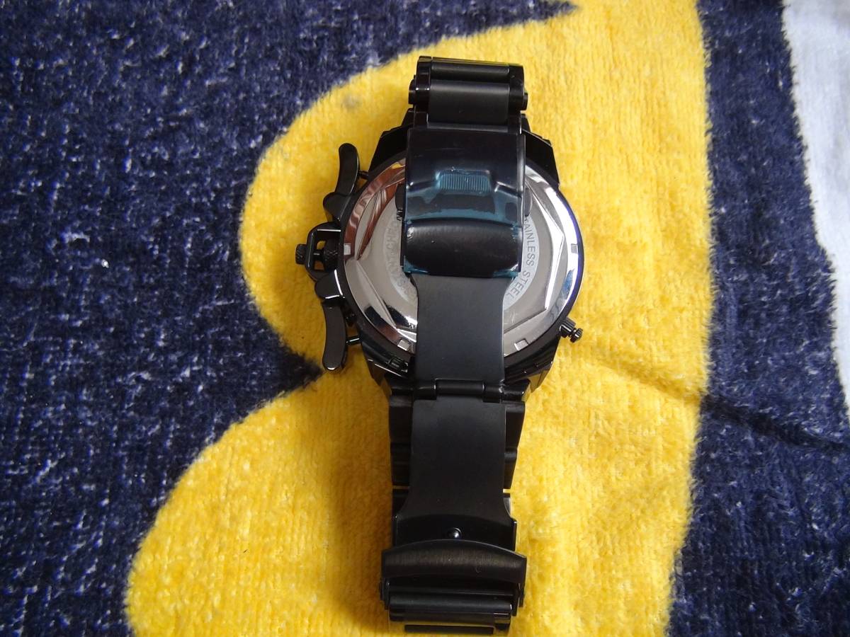 見ての通りのカッコ良さです。新品で買ってそのまま放置して電池が切れました。現在は止まっています。ずしんと思い300グラム、ケース5センチ、厚み1,7センチ、ベルトの長さ16センチオールブラックで針がレットでカッコ良いです。電池を入れて動くと言う保証はありません。