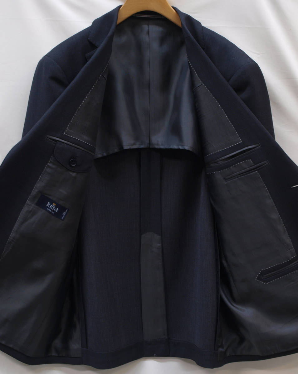 【サイズ】 BB5 (BBM、BE5号相当) 目安の体型 身長165cm~175cm、ウエストサイズ94cm前後 【ジャケット実寸】 肩幅47.5cm 着丈70.5cm 袖丈59.5cm 脇下部分56cm 身幅53cm 【パンツ実寸】 ウエスト(胴回り実寸)94cm わたり幅37cm 股下10cm部分33.5cm 裾幅23.3cm 脇股上28.5cm 前股上31.5cm 股下90cm(裾上げしていない状態/新品) 【素材】 表地:ウール(毛)100% 裏地:胴裏/ポリエステル100% 袖裏/ポリエステル100% ・イタリア、レダ(REDA)社のSUPER110'S生地を使用 高級イタリア製生地特有のなめらかな触り心地の上質な素材です。 【色】 濃紺系 【柄】 濃紺色地にミディアムグレーのピンヘッド織柄 【デザイン】 細すぎずかといってゆとりがありすぎることなく、体型に無理なくきれいにフィットする、シングル2つボタンスーツ、レギュラーフィット、ビジネススーツ新品、裾上げしていない状態です。 ・ジャケットはシングル2つボタンでレギュラータイプ ・パンツは股上は浅くなくウエストラインで履くタイプで少しだけゆとりをもたせたちょうど良いくらいのすっきりシルエットのワンタックスラックスです。 春夏商材ですがあまりすけ感のないほどよく厚みのある生地を使用した背抜き仕様のスーツで、ご着用の地域にもよりますが真冬を除く春夏秋のほぼオールシーズン対応致します。 【縫製仕様】 ・ジャケットはシングル2つボタン、ノッチドラペル、襟元等AMFステッチ入り、袖口ボタン4つ、センターベント、内ポケット4つ(小ポケット2つ含む)、背抜き(春夏秋物) ・パンツはワンタック、膝裏当て付き、脇ポケット斜め付け、後ろポケット両玉縁で左のみボタン付き、フロントはファスナーでホック仕様/うちかけボタンあり 使用付属(肩パット、毛芯等)もワンランク上のを使い、細部まできれいな縫製仕立てで仕上がっております。