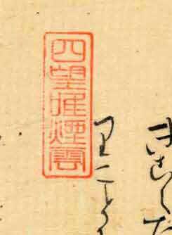 落款の「讃」の元になるその原文の個所には、 「四望唯煙雲」《四望(しぼう)するも唯(ただ)煙雲(えんうん)のみ》という白楽天の漢詩の篆書印が押捺されている。漢詩の意味は、「あたりを眺めても靄(もや)と雲しか見えない」という意味。この漢詩は「白氏文集」に由来するものです。 つまり、原文の内容に関する漢詩の落款を押捺しているのは、茶会における床の間の「掛け軸」(かけじく)を拝見(はいけん)の際に、茶会を主催する亭主が、客に「最高のごちそう」を振る舞うために披露したものです。茶会の際に落款に記された由来を知った客が広くそのことを社会に広めたために結果的に、多くの茶会に開催される「最高のごちそう」として原文に関係する漢詩の落款を付したものです。「落款」の漢詩の由来を待合において説明する際に、長い時間を要し、茶会における貴重な時間であったと推定されております。 |
