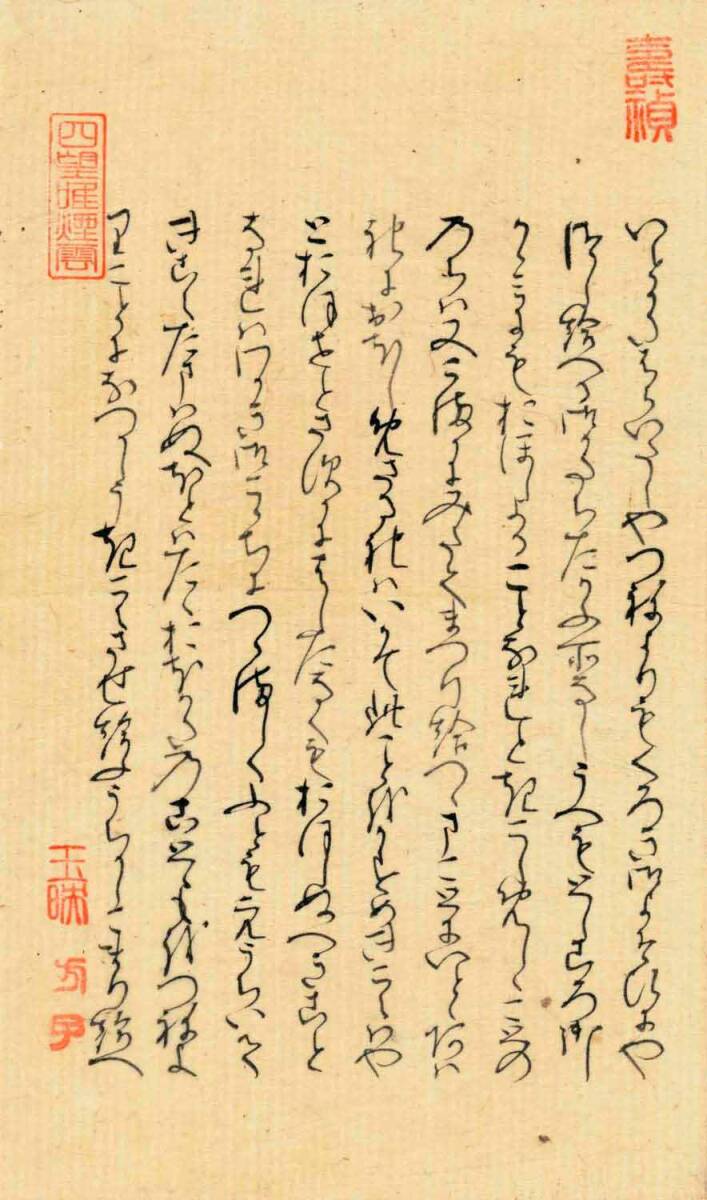原文上部には「四望唯煙雲」《四望(しぼう)するも唯(ただ)煙雲(えんうん)のみ》という白楽天の漢詩の篆書印が押捺されている。漢詩の意味は、「あたりを眺めても靄(もや)と雲しか見えない」という意味。この漢詩は白楽天の「文集」の中の有名な一節です。紫式部が「薄雲」を書くに際し、「白楽天・漢詩集」の漢詩を熟読したうえで「源氏物語」の「薄雲の巻」を書いていることがわかります。この原詩の言葉の引用は、「薄雲の巻」に用いられていることで広く知られている。紫式部がこの原詩に親しんでいたことがわかる。