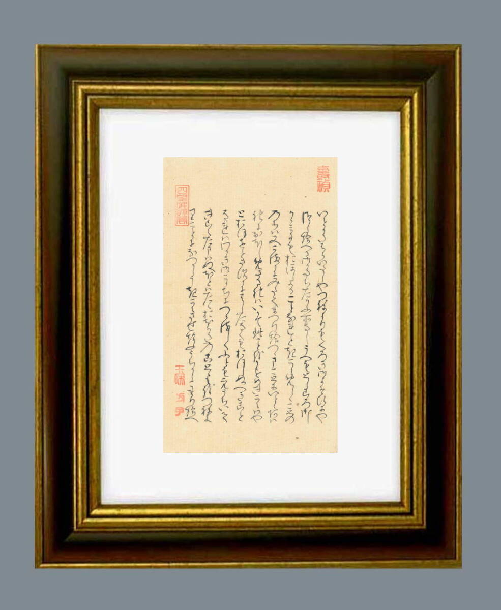 「源氏物語」自筆の大きさ タテ21.8センチ ヨコ12.8センチ。額縁の大きさは タテ37.0センチ ヨコ28.0センチです。額縁は新品です。 |