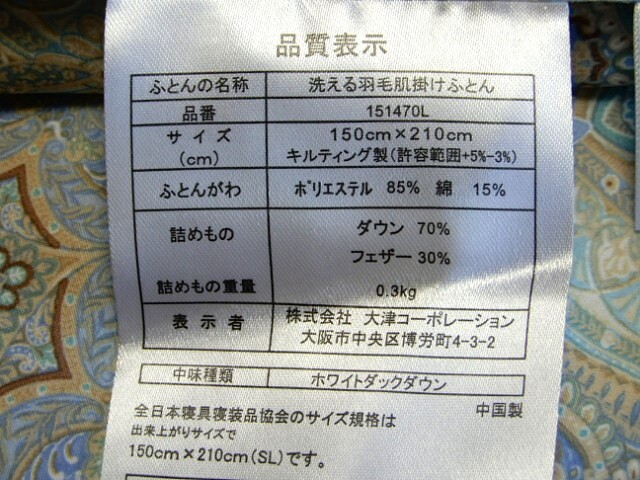 | 商品サイズ : 150×210cm 材質 : 側生地:ポリエステル85%綿15% 詰め物/ホワイトダックダウン70%フェザー30%(0.3kg) 商品状態 : 未使用 ・ふわっと軽いのに保温性があり冬は暖かく、通気性が良いので夏も快適です。 ・ネット使用でご家庭でも洗えます。 ・株式会社大津コーポレーション | |||