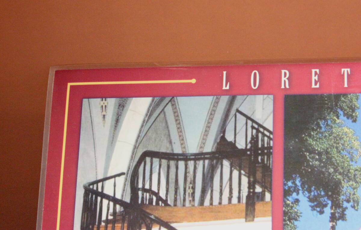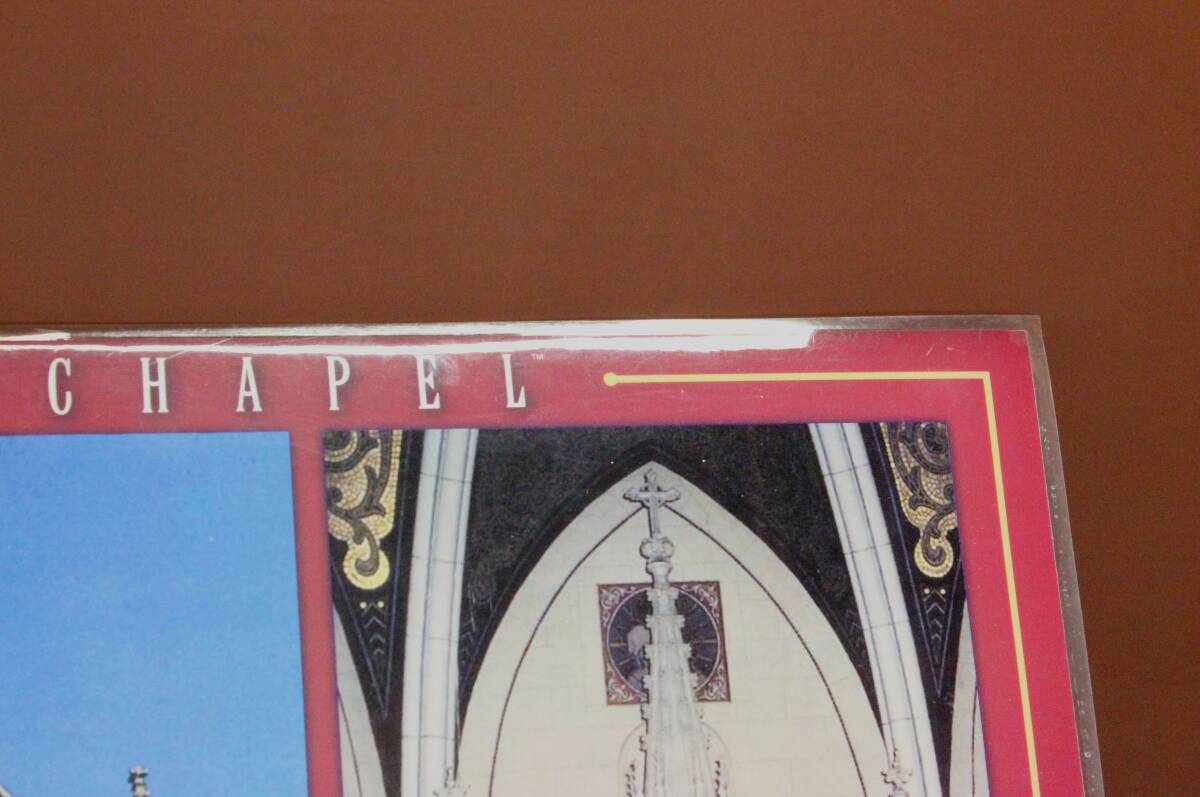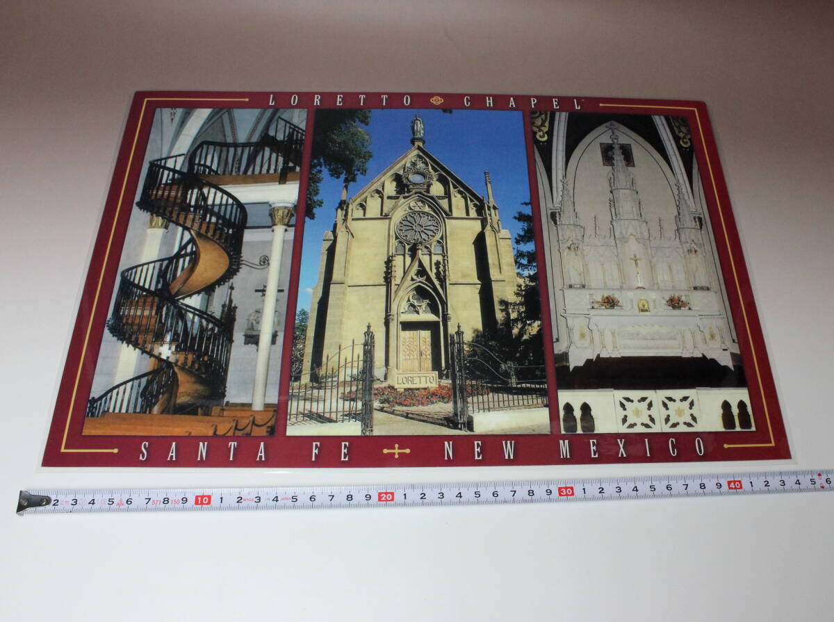 支柱の無い”奇跡の螺旋階段”で有名な、ロレットチャペル (アメリカ ニューメキシコ州サンタフェ)のラミネートポスター。現地、教会併設のギフトショップで購入しました。左から、奇跡の階段、チャペル外観、内部の祭壇 の写真になっています。裏面は無地です。水や汚れ、色あせにも強い、パウチラミネート加工済みです。