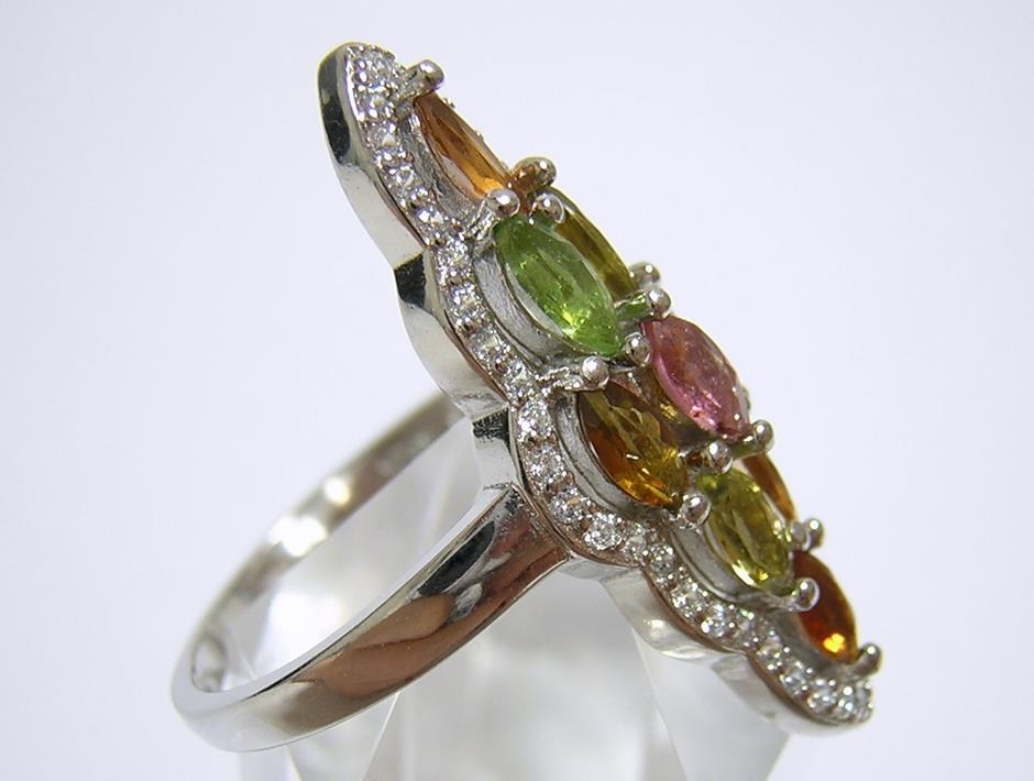 ブラジル産の天然マルチカラートルマリンとキュービックジルコニアを使用したデザインリングです。 【中石】天然トルマリン 【産地】ブラジル産 【処理】非加熱 【カット】マーキスカット 【脇石】キュービックジルコニア 【重さ】4.1g 【サイズ】15.75号 (お直しは承れません) デザイン部:縦28mm×横20mm 【素材】シルバー925 (14金ホワイトゴールド仕上げ) 【刻印】S925 【状態】新品 ※地金部分に製作時からの小傷やスレが多数あります。 |