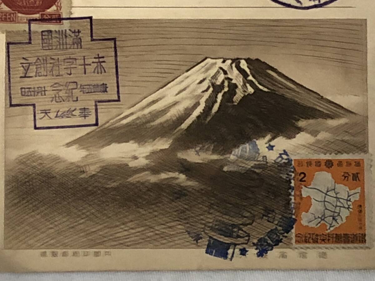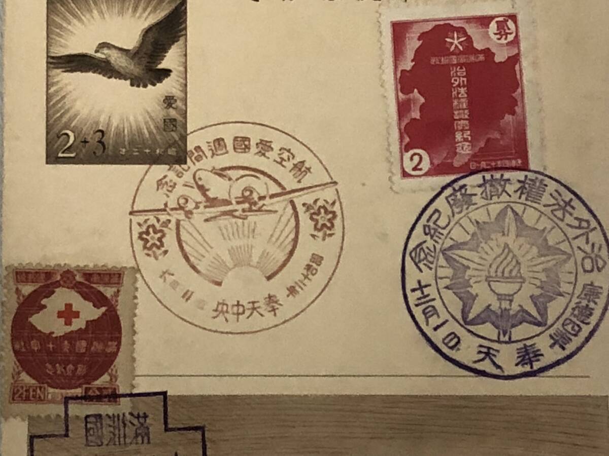 | 古絵葉書『大日本帝国 愛国募金はがき2+3銭(E)』満洲切手3枚貼付(鉄道壱萬粁突破紀念2分・治外法権撤廃紀念2分など)/スタンプ3か所押印 | ||