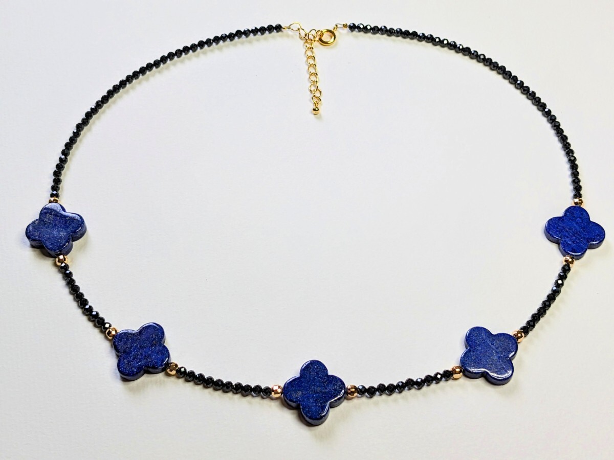 【数量限定になります】 使用石 : 天然ラピスラズリ(染色処理なし) 約20mm 四つ葉のクローバーモチーフ 天然ブラックスピネル 約3mmカット キラキラ輝きます メタルパーツ : 約4mm カットビーズ 真鍮製(メッキ加工) 金具 : 引き輪式 アジャスター約5cm 真鍮製(メッキ加工) 長さ : 約55cm(アジャスター約5cm含む) 天然石由来のクラックやインクルージョンが確認できます。 画像はサンプル画像ですが、サンプル画像と同品質の商品をお送りします。 天然石ですので、色合いやインクルージョンは個々に違いはあります。 | |||