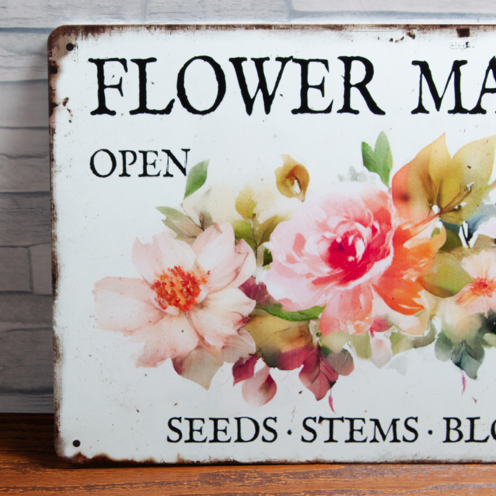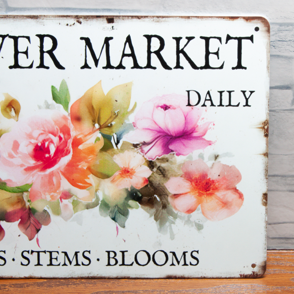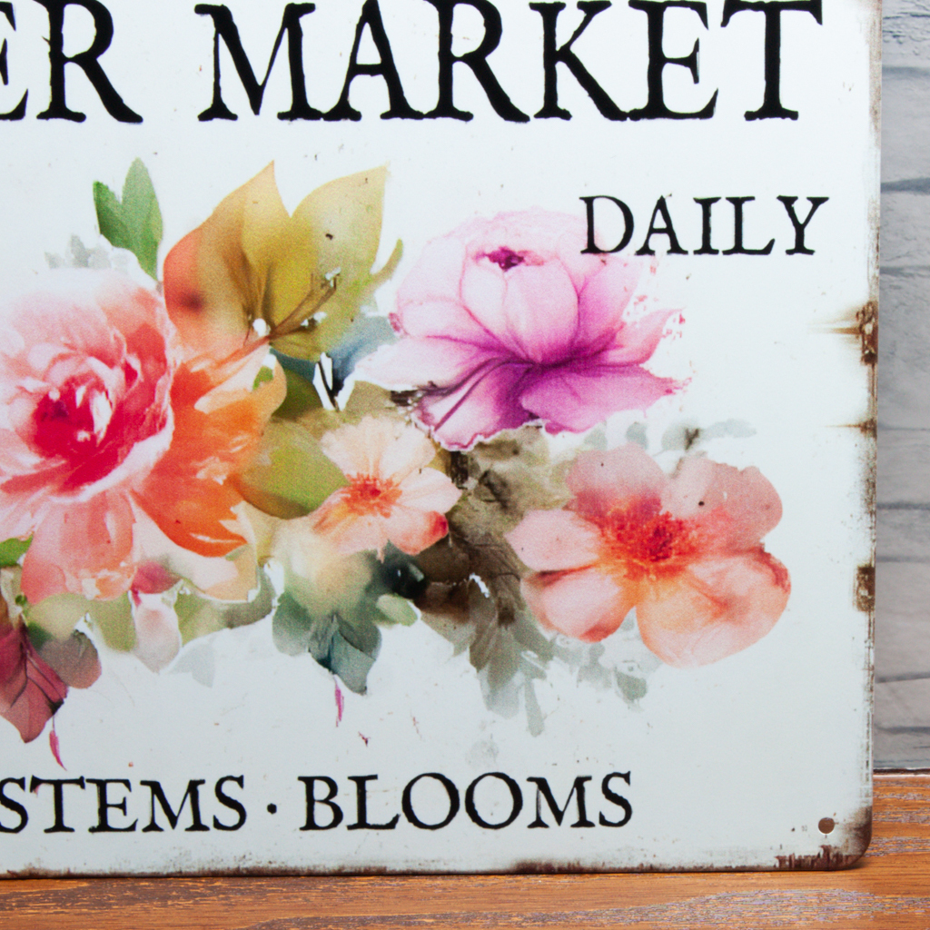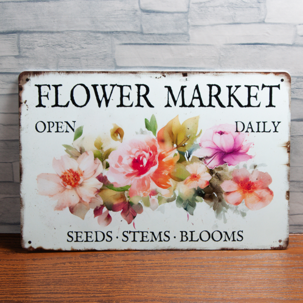 ブリキ看板 FLOWER MARKET ウエルカムボード 花模様四隅に約5㎜の紐等の通し穴が御座います。