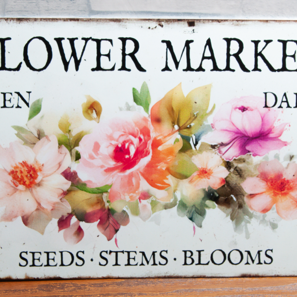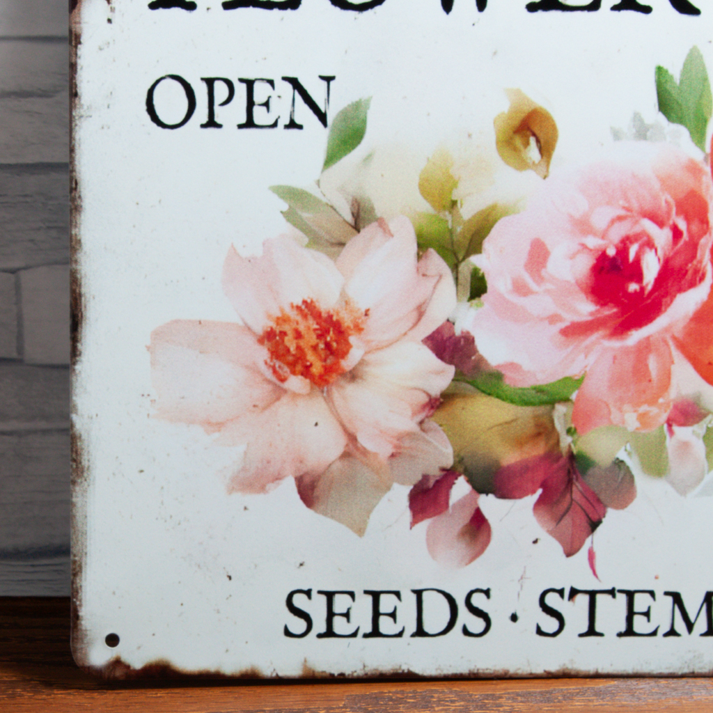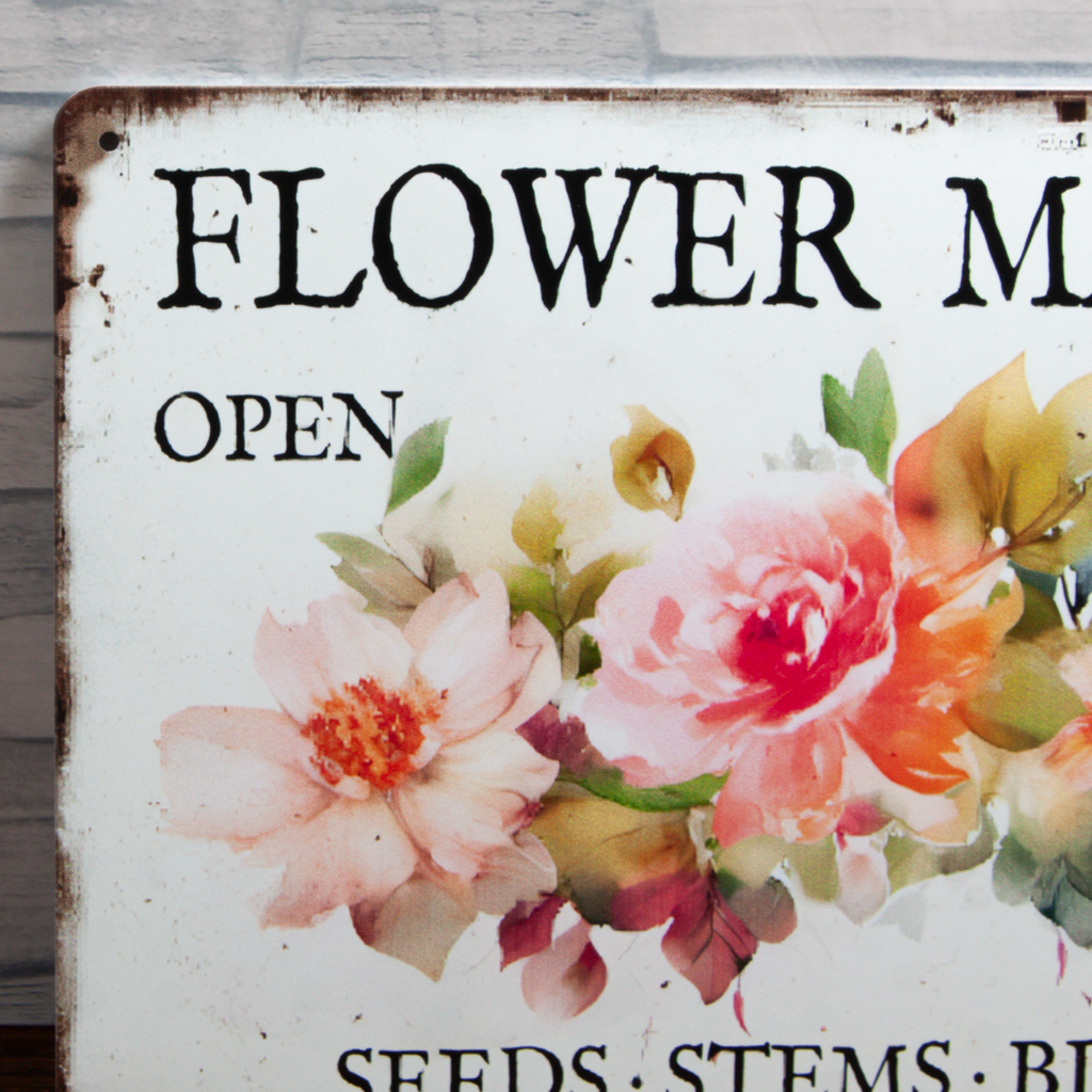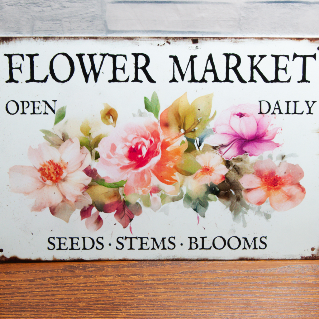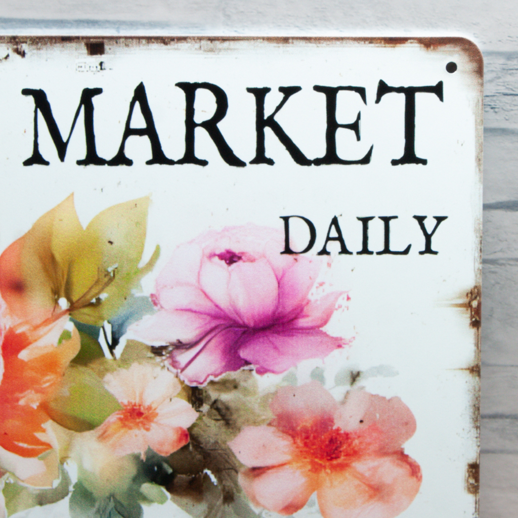 ブリキ看板 FLOWER MARKET ウエルカムボード 花模様四隅に約5㎜の紐等の通し穴が御座います。