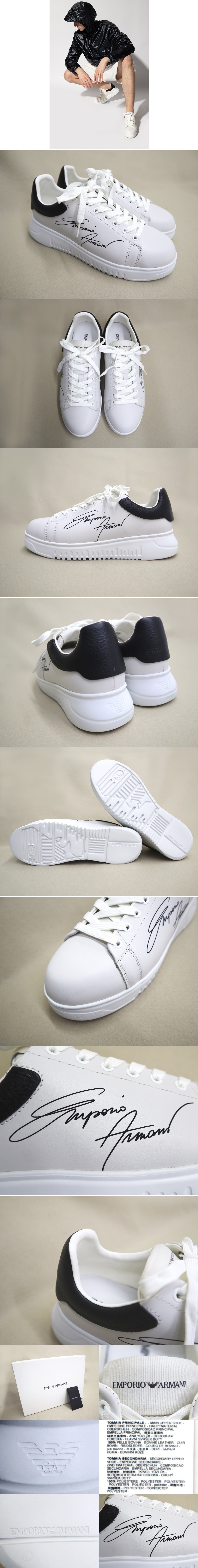 10万新品◆7=25.5㎝◆EMPORIOアルマーニ サインロゴ入り 牛革レースアップレザースニーカー 白×黒 オフホワイト