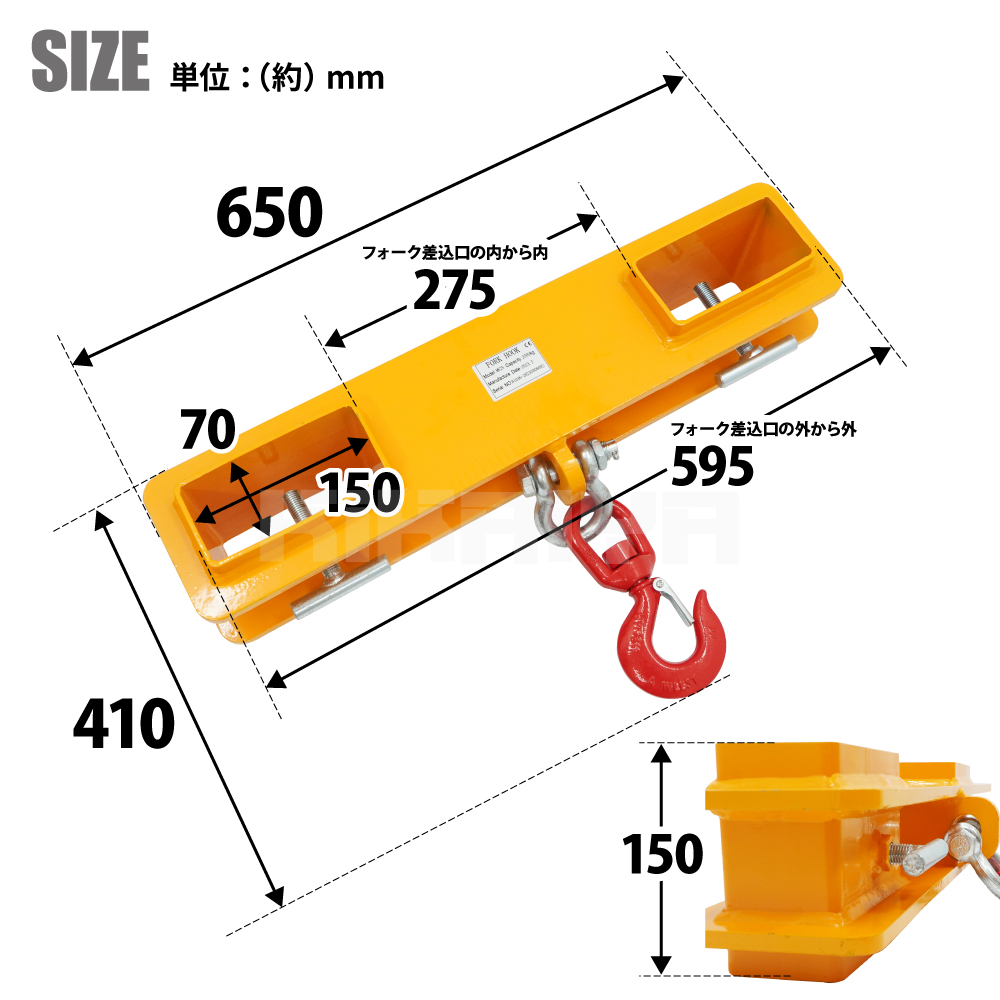 ●装着可能なフォーク爪サイズは幅145mm、厚さ65mmまでです ●使用するシャックルは強力大型シャックルに変更しております ●フォークリフトの爪に装着して吊り上げできる金具です ●装着は簡単に行え、金具のずれ防止ねじは工具を使わず手でも回せます ●フックは360°回転と前後左右に振れます ●欧州CE規格取得商品です |