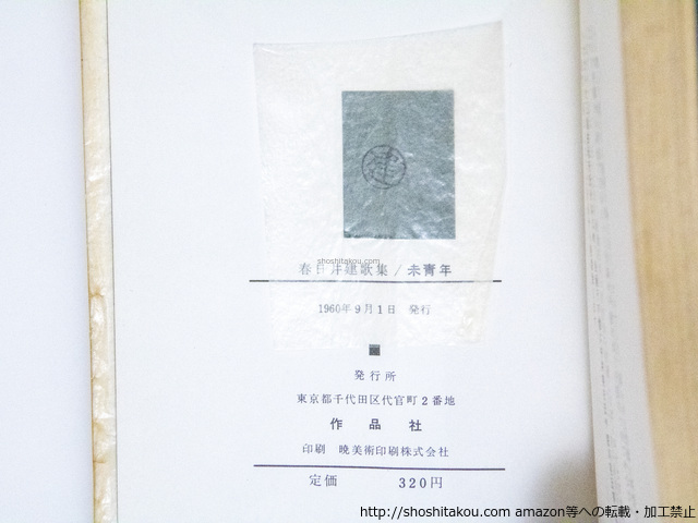 未青年 初版 岡井隆宛署名入 / 春日井建 三島由紀夫序 ◯当店在庫から「春日井建」の本を探す| ★ 発送方法 (送料無料) ・日本郵便のゆうパケット・レターパックライト・レターパックプラス・ゆうパックの中から荷姿の大きさに適した方法で発送します。(発送方法や到着日時はご指定いただけません。) ・上記発送方法はすべて追跡番号付き・土日配送有・速達扱いです。ゆうメールや定形外は発送に使用いたしません。 ・ゆうパケット・レターパックライトは郵便受けにお届け、レターパックプラス・ゆうパックは配達員対面受取です。防水梱包します。 ★ 必ずお読みください ・代金決済後の次の火木土に発送します。 ・ストア出品です。ご注文時に必要事項のご記入・決済いただいた後は、やり取り不要です。商品の到着をお待ち下さい。 ・肉筆物・美術作品は真作保証いたします。 ・商品のレファレンス(調べ物)サービスは行っておりません。また当店商品以外の無料鑑定は行っておりません。 |