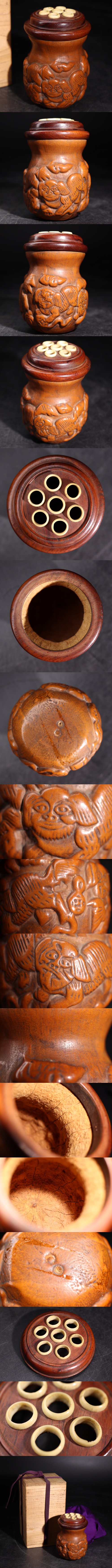 | 希少 瓢箪 戌文 筆筒 仕覆・木箱付 / 骨 古瓢箪 木製 筒 彫刻 細密 書道具 文房具 .G1963 |