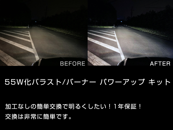 | 商品説明 | 純正が暗くてお悩みの方におすすめ 純正D2バルブが暗いと感じるユーザー様に更なる明るさ(視認性)を実現!! 視認性の大幅なUPで運転もスムーズに、抜群明るさで同じ車種に差を付けれること間違いなし!! 35Wの純正バラストを55Wバラストに交換して 明るくするHIDキットです。 加工は不要なので、簡単に交換が可能です。 車検にも対応しているので、安心して交換できます。 取り付け方法 ・ヘッドライトを外し、既存の純正HIDバルブとバラストを取り外す。 ・純正に接続してあった配線をそのままパワーアップキットに繋ぎ直し、バラストを取り付ける。 ・バルブも純正バルブと同じように取り付けて、ヘッドライトを元に戻す。 ※タイトルや適合は車種と適合の一部を掲載の為、必ずご購入前に現車にてご確認をお願いします。 ※非常に強い発光をしますので、お取付の際は、直視なさらないようにご注意下さい。 |