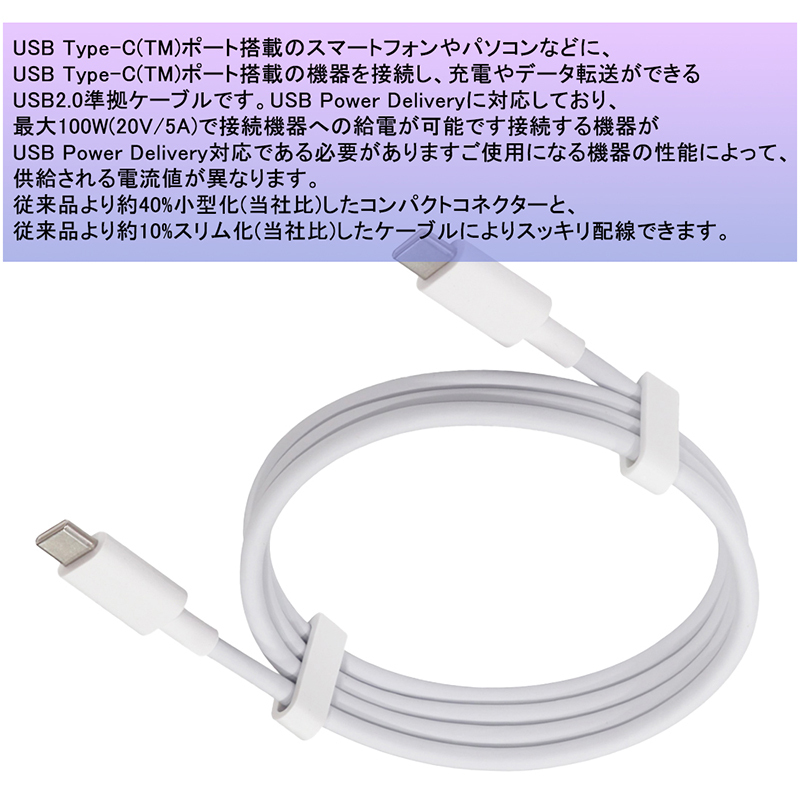 USB Type-C(TM)ポート搭載のスマートフォンやパソコンなどに、USB Type-C(TM)ポート搭載の機器を接続し、充電やデータ転送ができるUSB2.0準拠ケーブルで