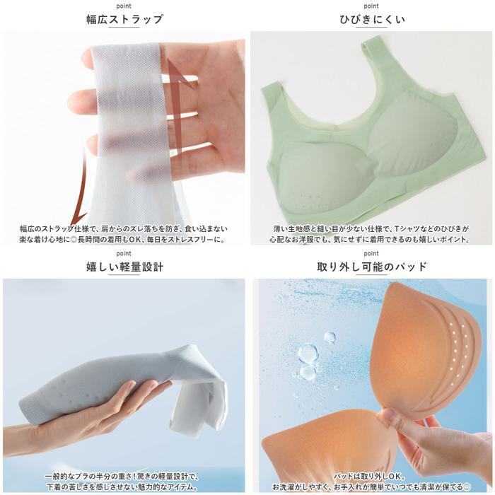 | 商品説明 | ・・極薄タイプの生地で、まるで着けてない感覚◎涼しい着け心地で暑い季節にぴったり!「冷感ブラジャー ノンワイヤー」が登場。 ・【薄い生地を採用】 ・極薄の生地を採用。まるで着けていないかのような楽な着心地を実現。冷感タイプなので、暑い季節も快適に。肌に馴染む薄さで、後ろ姿もすっきり決まる◎ ・【ノンワイヤー&ノンホック】 ・楽な着け心地にこだわったノンワイヤー&ノンホック仕様。スポーツブラタイプなので、着脱がラクチン!スポーツシーンやお家でのリラックスタイムにぴったり! ・【通気性◎】 ・パッド部分も薄めに設計。胸をほど良くホールドしながら、通気性もバッチリ。パッドの下部分には穴を特殊加工し、ムレを軽減。 ・【幅広ストラップ】 ・幅広のストラップ仕様で、肩からのズレ落ちを防ぎ、食い込まない楽な着け心地に◎長時間の着用もOK、毎日をストレスフリーに。 ・【ひびきにくい】 ・薄い生地感と縫い目が少ない仕様で、Tシャツなどのひびきが心配なお洋服でも、気にせずに着用できるのも嬉しいポイント。 ・【嬉しい軽量設計】 ・一般的なブラの半分の重さ!驚きの軽量設計で、下着の苦しさを感じさせない魅力的なアイテム。 ・【取り外し可能のパッド】 ・パッドは取り外しOK。お洗濯がしやすく、お手入れが簡単でいつでも清潔が保てる◎ ・【選べるカラー】 ・ベーシックカラーのラインナップ。お好みのカラーをチョイスして、お気に入りのインナーで気分をUPさせよう♪ |