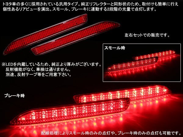 純正リフレクターと同形状のため、取付けも容易に行え個性あるリアビューを演出。 スモール、ブレーキに連動する2段階の光量で点灯します。 他のモデルは⇒ こちら ◆適合車種 SAI/サイ AZK10 全グレード 20系アルファード Sグレード 30系アルファード X/G/GFグレード 110系イスト 全グレード 10系ウィッシュ 後期のみ 20系ウィッシュ Zグレード 20系ヴェルファイア Zグレード 30系ヴェルファイア X/G/GFグレード 110系 ヴェロッサ 全グレード 70系ヴォクシー Z/ZSグレード 70系ノア S/SI 10系ハリアー 全グレード 60系ハリアー 全グレード 130系 マークX ※記載車種以外にも適合します。 LEDを内蔵しているため、純正品より厚みがございます。 反射機能がないため、車検には通りません。 別途、反射テープをご用意下さい。 輸入品のため、防水処理後のご使用をお勧めします。 |