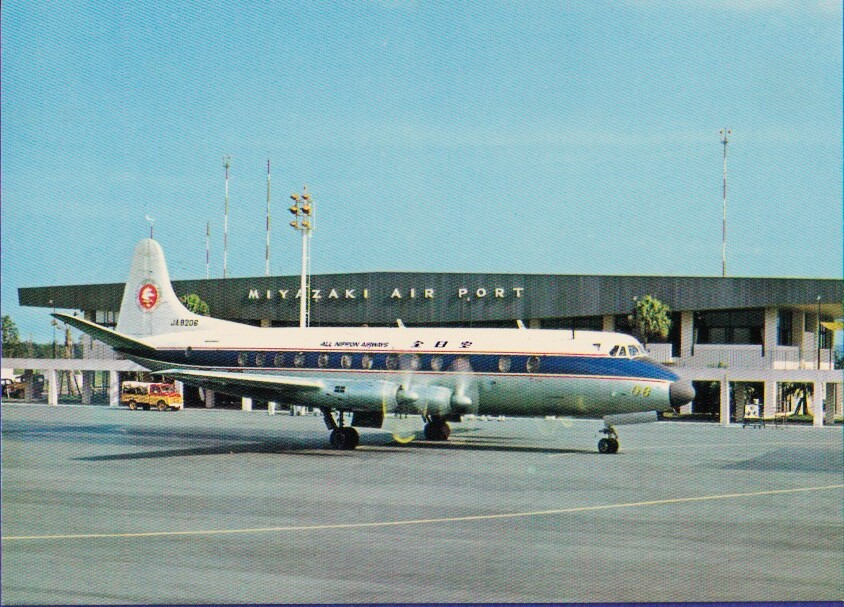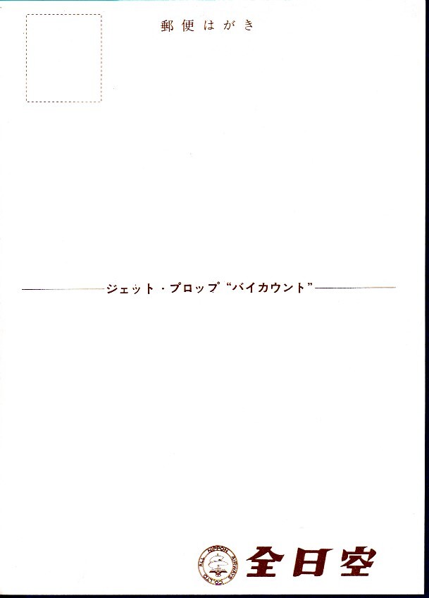 同機の登録:1962.05, 抹消:1970.10。構図3の説明文:「ジェット・プロップ”バイカウント”」。裏面の社名表示:「全日空」で従来の「全日本空輸」とは異なってます。
