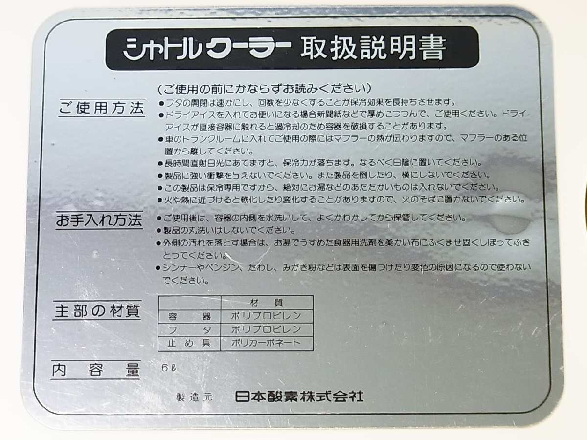 | ■■■メーカー■■■ 日本酸素(サーモス) ■■■品 名■■■ シャトルクーラー 真空遮断アイスボックス ■■■品 番■■■ ICA-6000 ■■■カ ラ ー■■■ 青/ブルー ■■■サ イ ズ■■■ 約31.5×31.7×16cm/6L ■■■状 態■■■ 【USED】 USEDですので、外側にスレ、よくよく見ると薄い変色等ございますが、この類の物として良好です。ショルダーベルトが欠品しております。保管品であることをご理解の上、ご入札ください。 ※外箱の色明記と実物が違います事をご了承下さい。 ※お譲りする物は画像の物が全てです。 ※外箱にスレ、薄い汚れ等の傷みがございます。 ※状態や付属品の有無につきましては、できるだけ詳細を記載するよう心掛けておりますが、見落しや欠品があった場合でも現状優先となります。状態や付属品等に関して、気になることがございましたら、事前に必ずご質問くださいませ。 ■■■商品説明■■■ ★★真空遮断アイスボックス ICA-6000★★ ●真空だから氷長持ち2日間 ●魔法ビン技術から生まれた真空断熱パネル採用。 【付属品】外箱 ※ショルダーベルトは欠品しております。 |
