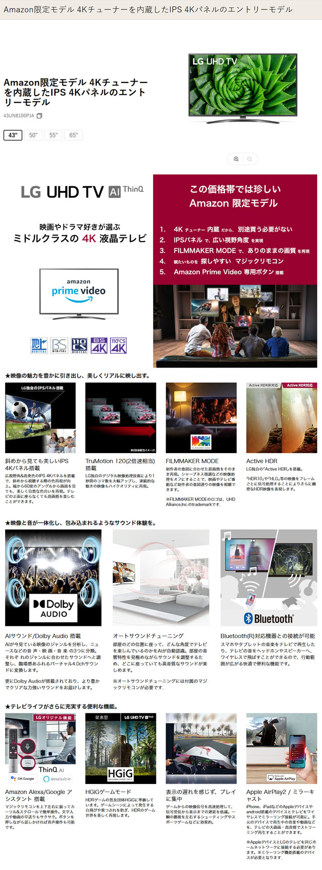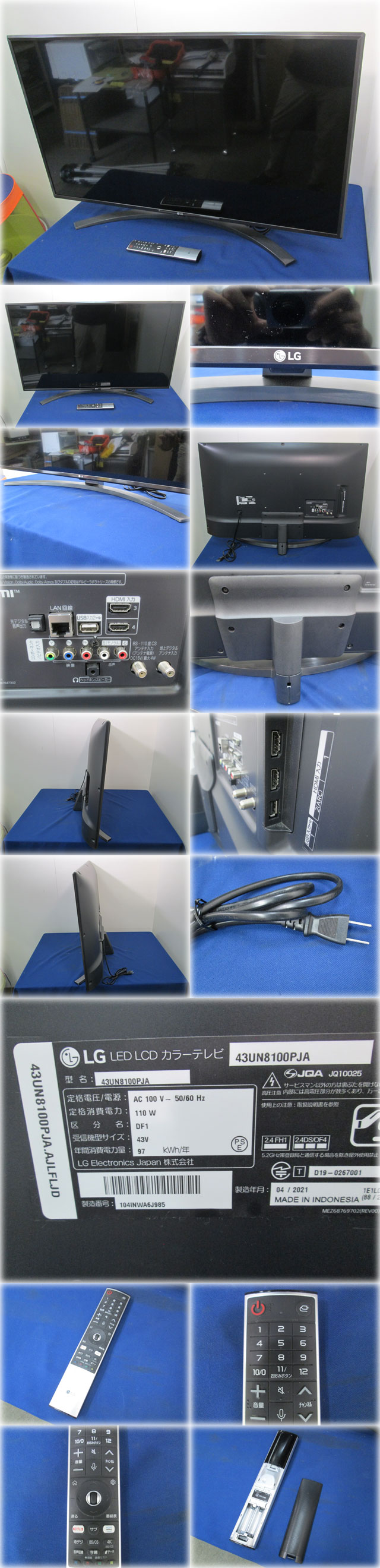 LG 43V型4K液晶テレビ 43UN8100PJA を出品いたします。 ■特徴■ 斜めから見ても美しいIPS 4Kパネル搭載 広視野角&高発色のIPS 4Kパネルを搭載で、 斜めから視聴する際の色再現が向上。 端から60度のアングルから画面を見ても、 美しく自然な色合いを再現。 テレビの正面に座らなくても 高画質を楽しむことができます。 TruMotion 120(2倍速相当)搭載 LG独自のデジタル映像処理技術により 1秒間のコマ数を大幅アップし、 連続的な動きの映像もハイクオリティに再現。 FILMMAKER MODE 制作者の意図に合わせた原画質をそのまま再現。 シャープネス強調などの映像処理をオフにすることで、 映画やテレビ番組など 制作者の意図通りの映像を視聴できます。 Active HDR LG独自の「Active HDR」を搭載。 「HDR10」や「HLG」等の映像を フレームごとに信号処理することにより さらに緻密なHDR映像を表現します。 AIサウンド/Dolby Audio 搭載 AIが今見ている映像のジャンルを分析し、 ニュースなどの音声・映画・音楽の3つに分類。 それぞ れのジャンルに合わせたサウンドへと調整し、 臨場感あふれるバーチャル4.0chサウンドに変換します。 更にDolby Audioが搭載されており、 より豊かでクリアな力強いサウンドをお届けします。 オートサウンドチューニング 部屋のどの位置に座って、 どんな角度でテレビを楽しんでいるのかをAIが自動認識。 部屋の音響特性を見極めながらサウンドを調整するため、 どこに座っていても高音質なサウンドが楽しめます。 ※オートサウンドチューニングには付属のマジックリモコンが必要です. Bluetooth(R)対応機器との接続が可能 スマホやタブレットの音楽をテレビで再生したり、 テレビの音をヘッドホンやスピーカーへ、 ワイヤレスで飛ばすことができるので、 行動範囲が広がる快適で便利な機能です。 Amazon Alexa/Google アシスタント 搭載 マジックリモコンを上下左右に振って カーソル&スクロールで簡単操作。 文字入力や動画の早送りもサクサク。 ボタンを押しながら話しかければ音声操作も可能です。 HGiGゲームモード HDRゲームの普及団体HGiGに準拠しています。 ゲームシーンによって発生する白飛びや黒つぶれを防ぎ、 HDRのゲーム世界を美しく再現します。 表示の遅れを感じず、プレイに集中 ゲームからの映像信号を高速処理して、 信号受信から表示までの遅延を低減。 一瞬の勝敗を左右するシューティングや スポーツゲームなどに効果的。 Apple AirPlay2 / ミラーキャスト iPhone、iPadなどのAppleデバイスや android搭載のデバイスとテレビを ワイヤレスでミラーリング接続が可能に。 手元のデバイスで再生中の音楽や動画などを、 テレビの大画面・高音質で ストリーミング再生することができます。 ※AppleデバイスとLGのテレビを同じホームネットワークに接続する必要があります。 ※ミラーリング機能搭載のデバイスが必要となります. ■仕様■
