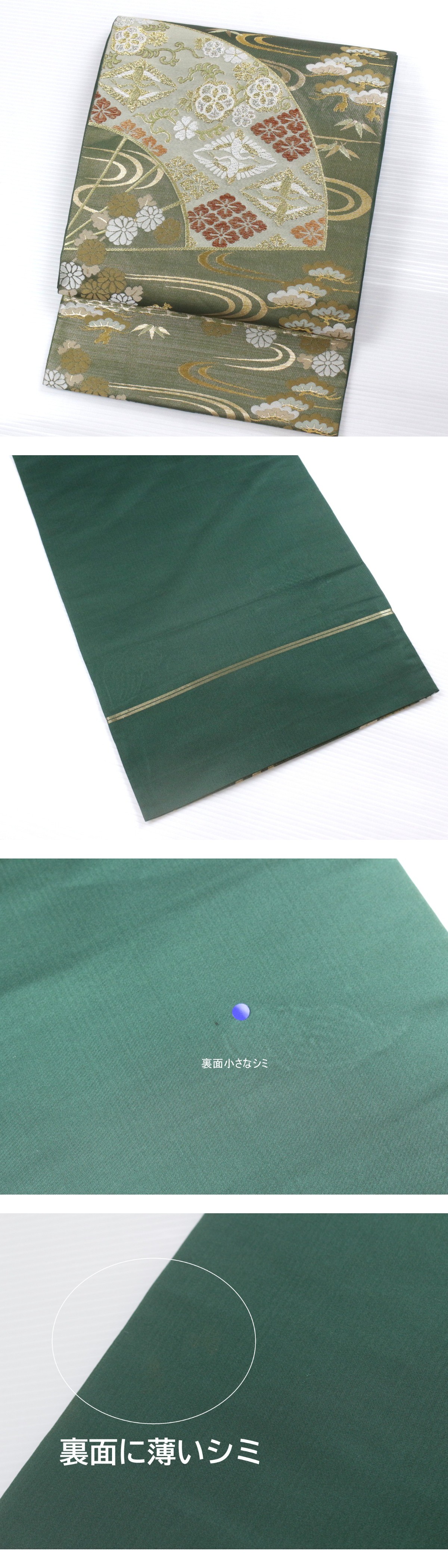 刺繍織の美しい正絹袋帯のご紹介です。 扇面取りの中には菱文や花文があしらわれ、吉祥の趣を漂わせています。 帯全体には流水文が流麗に織り出され、四季の花々や松竹が添えられることで、格調の高さとともに穏やかな華やぎを感じさせます。 伝統的な文様が調和しながらも、控えめで品のある彩りが魅力で、訪問着や色無地などフォーマルなお着物に格別の相性をみせます。 お茶席や慶事など、格式を大切にしたい場面にふさわしい装いを叶えてくれることでしょう。 季節を問わずお締めいただける帯であり、ひとたび身につければ、着姿に上品な奥行きを与えてくれる逸品です。 装いに格を添える一帯として、ぜひご活用くださいませ。 【刺繍織】 刺繍のような文様を、織りの段階で表現する技法です。普通の刺繍のように後から針と糸で文様を縫い付けるのではなく、織機を使って、刺繍糸のような太い絹糸・金糸・銀糸・箔糸などを文様の部分に織り込んでいきます。 織り上がった文様は立体的な盛り上がりがあり、まるで手刺繍を施したかのような華やかさと厚みが出るのが大きな特徴です。 ※撮影時の部屋の照明によって画像の色に若干の差がございます。色味に差がございますことをご了承のうえご検討下さいませ。 …状態… 裏面にシミあり。 ※全くの新品ではございませんので、記載のない変色やスレ、ヤケ、その他僅かな難がある場合がございます。そのような理由でのキャンセルはお受けできませんので、ご了承の上ご検討お願いいたします。 |