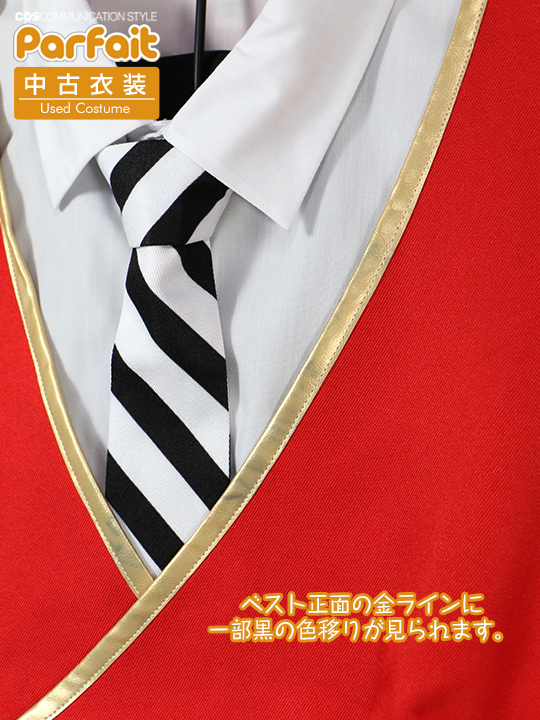 【中古コスプレ衣装】コスプレ衣装 ツイステッドワンダーランド/ハーツラビュル寮制服(Lサイズ) 【セット内容】 上着、ベスト、ブラウス、ズボン、ネクタイ、ベルト、腕章 【生地の種類】 ポリエステル 【コメント】 ハーツラビュル寮仕様の制服衣装です。手袋がありません。ズボンはウエストに一部ゴムが入っています。ズボンと上着の脇ポケットには実用性があります。ベストの背面は赤色の生地です。腕章エンブレムは合皮に刺繍で柄が再現されています。ブラウスの正面にうっすらと赤色移りがあります。(ベストで隠れます)金ラインとベルトは合皮製で状態は比較的良好ですが、ベスト正面の金ラインに一部黒の色移りが見られ、ベルトは折れ目などに小さな剥がれやベルト穴に一部いたみがあります。(2025/9時点) |