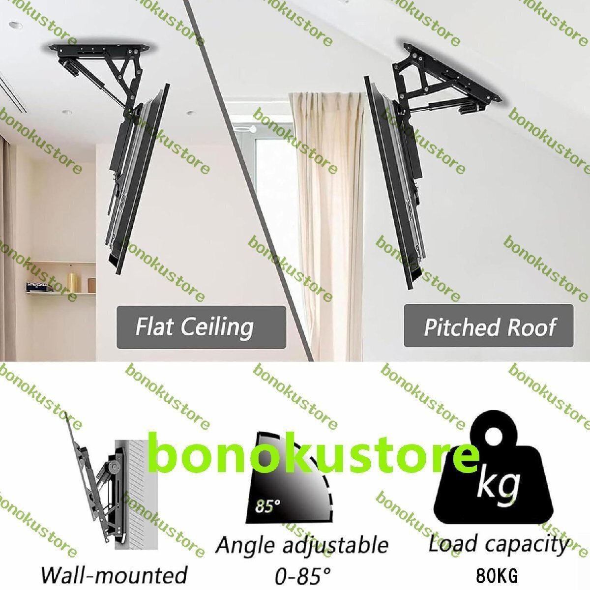 50インチ - 70インチ電動テレビ天井マウント、リモコン付き電動テレビブラケット、0?85°角度調整、最大耐荷重80kg、家庭、オフィス、会議室、ホテル用