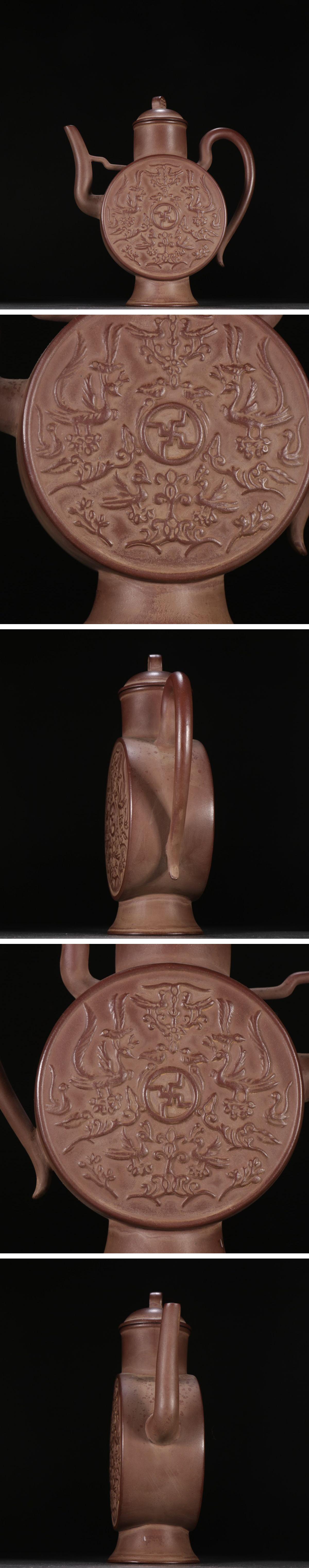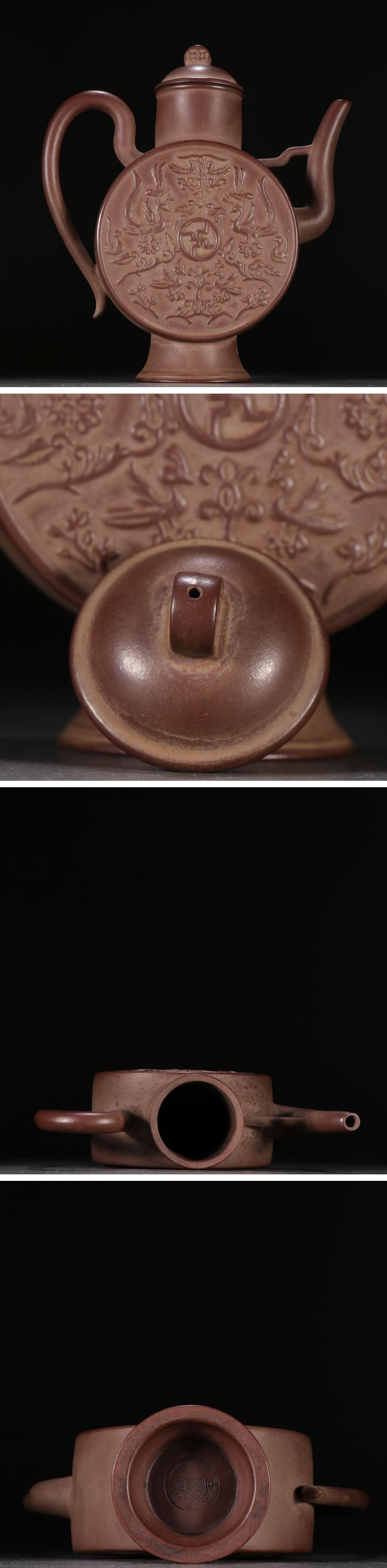 【清】某有名オークション購入 時代物 在銘 紫砂朱泥 百鳥紋急須 茶煎道具 古置物 古擺件 古美術 時代コレクション7L9-GT6