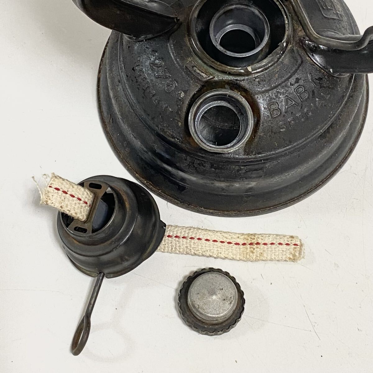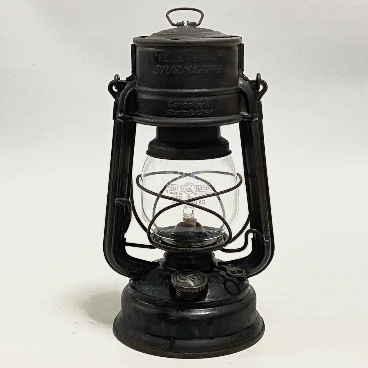 ご覧いただきありがとうございます。 1902 年創業のドイツの老舗ランタンメーカーFeuerhand(フュアーハンド)社の、ハリケーンランタンです。 stkとはSturmkappe(風防)の略称。現行モデル276とサイズは同じですが、風防付きの廃盤モデルです。 目立ったキズやへこみや変形はありませんが、風防の上部ふちにわずかなへこみがあります。 表面の劣化、サビがありますので、写真で状態のご確認をお願い致します。 ウィックの上下、バーナー部脱着、燃料キャップの脱着、リフターの上下など可動箇所に問題ありません。 タンクの漏れありません。 ホヤは欠けなく、きれいです。 本体高さ 26cm | ||