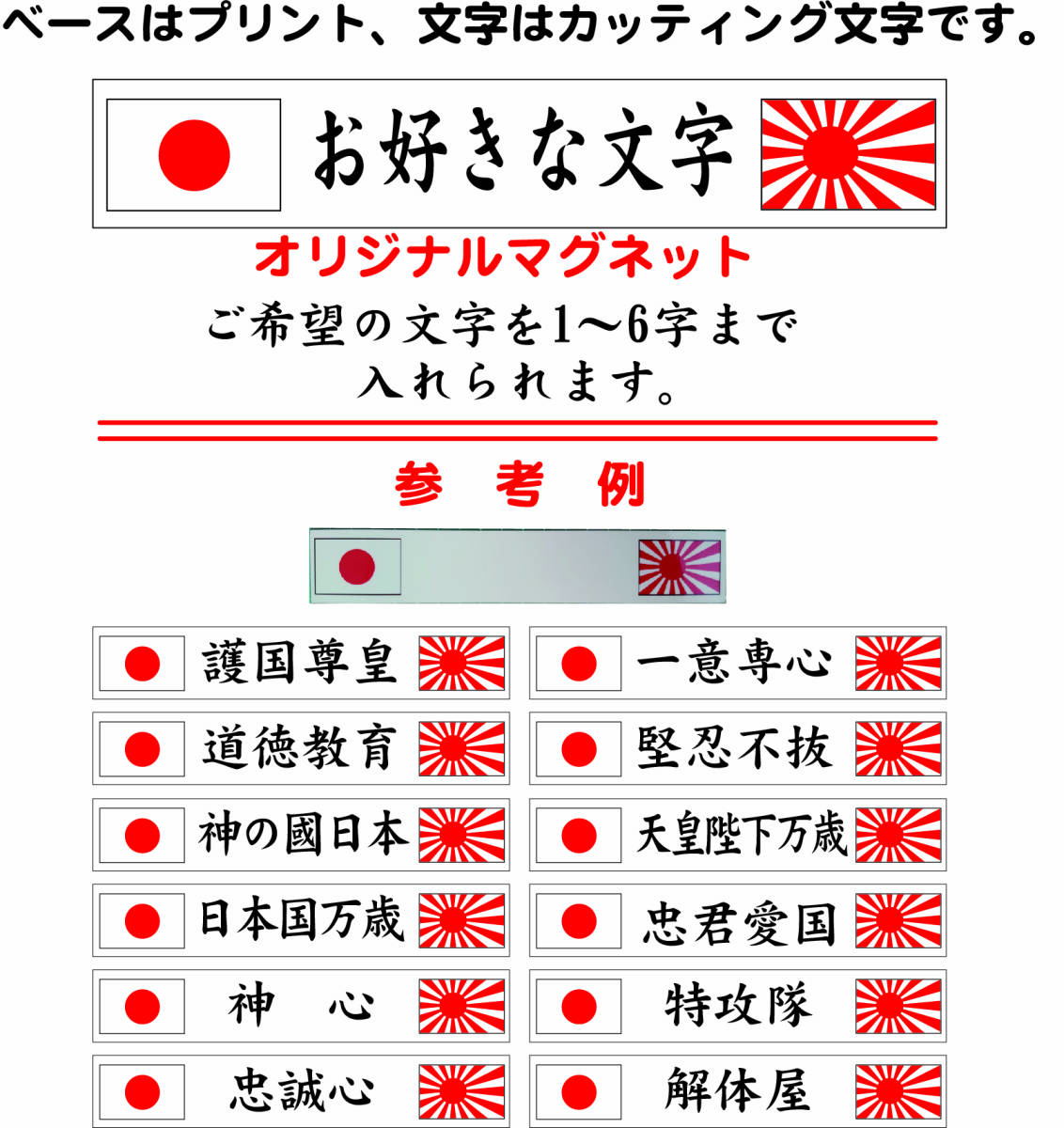 | 商品説明 | マグネットタイプのワンポイントです。 ご自身のオリジナル文言で1枚より制作致します。 日の丸、旭日旗、などベースはインクジェットプリントです。 文言文字はカッティング文字です。 落札後にご希望の文言文字、書体をご連絡下さい。 文言文字は1~6文字までで、パソコン変換可能の文字です。 色は基本黒ですが黒以外の場合は黒、白、赤、黄、紺、金、銀から選んでく ださい 連絡のない場合は黒で制作致します。 神社への参拝、旅行などにご利用下さい。 ひょっとするとドライブ中に後方からの煽り運転も 回避できるかも????? あくまで、ひょっとしてです。^^; サイズは約195mmX33mmですが1mm前後する場合があ ります。 出品商品以外の商品は3枚目の写真を参照して下さい。 |