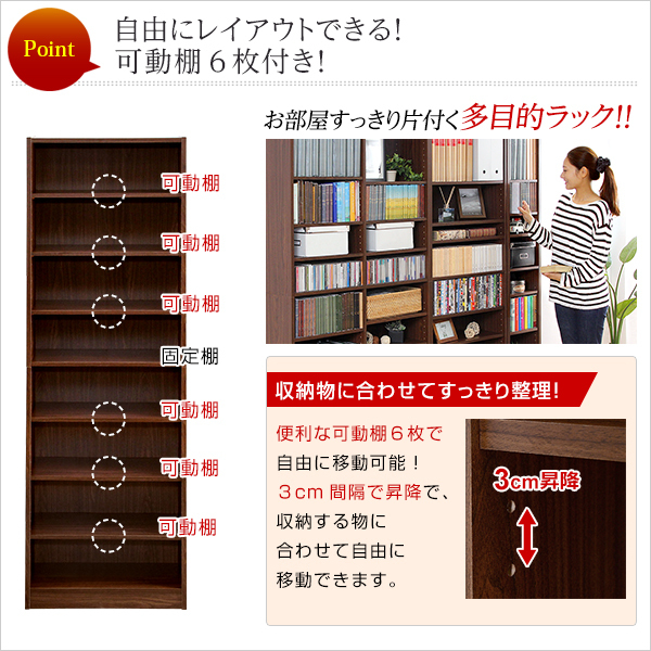 | 【カラー】 ダークブラウン、ナチュラル、ホワイト 【サイズ】 外寸:(約)60x29.5x180cm 【重量】 (約)22kg 【材質】 パーチクルボード、MDF、プリント紙化粧合板 【その他】 可動棚板6枚付き 【梱包】 2梱包でお届けします。 サイズ 2-1:(約)95x30.5x9cm 2-2:(約)59.5x30.5x15.5cm 重量:(約)23.5kg 【組み立て品】 お客様による組み立てが必要です。 |