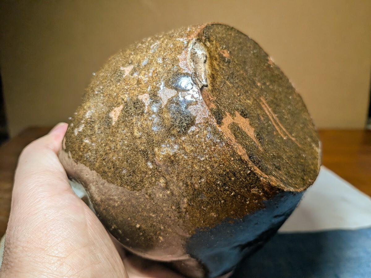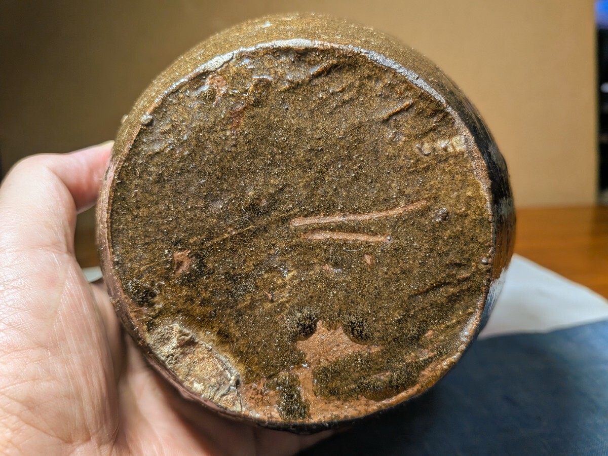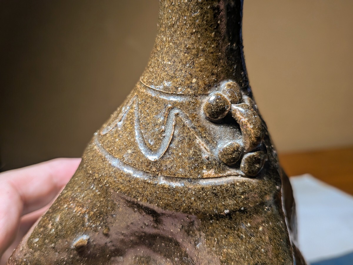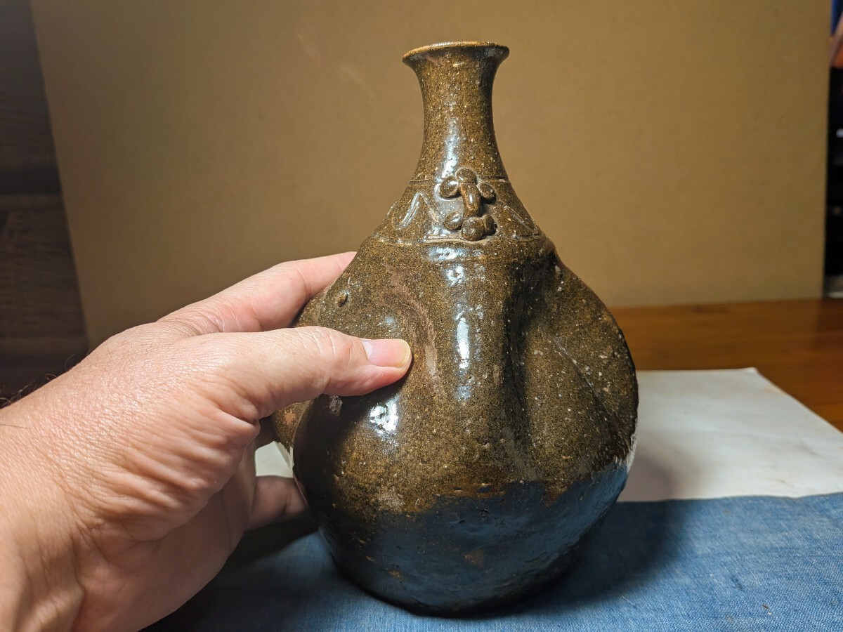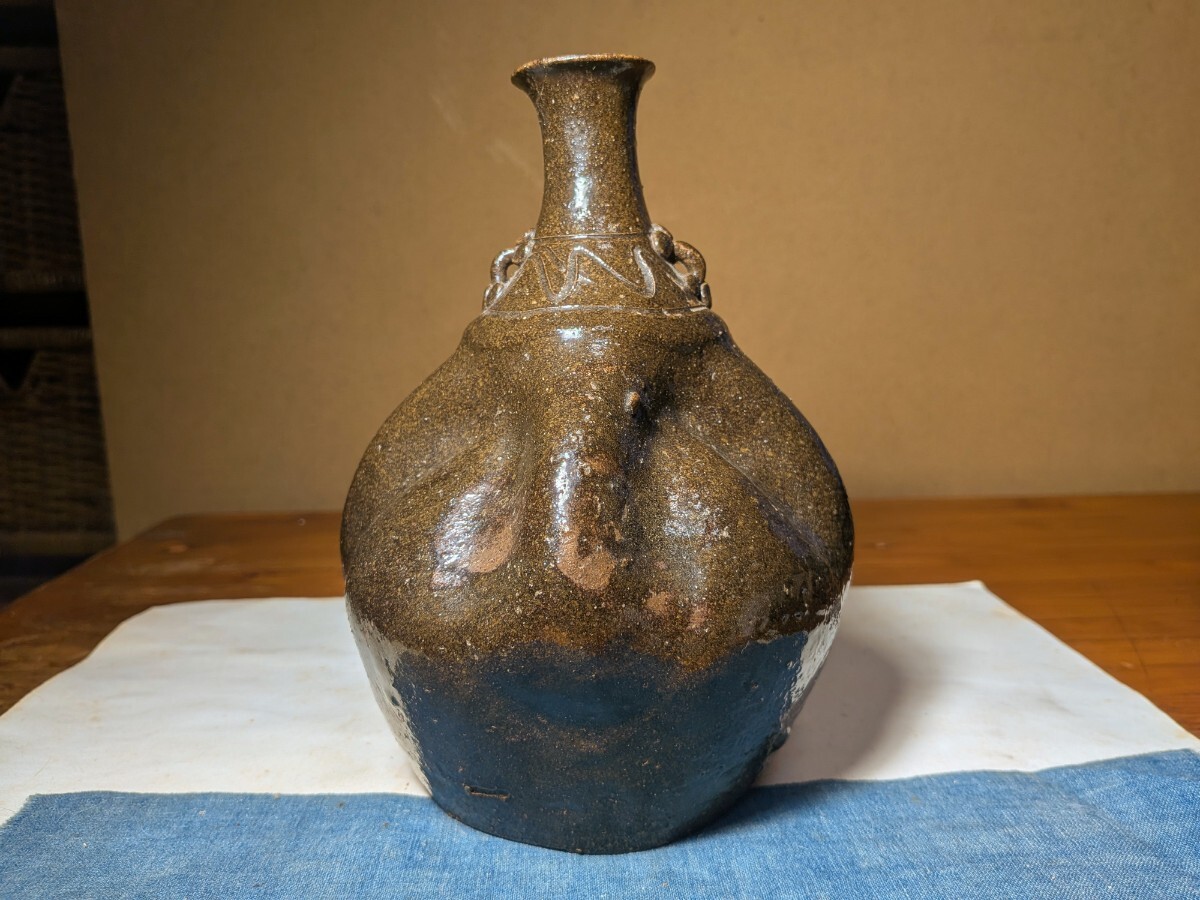 古高取の南蛮写しの皮袋形徳利です。名窯として知られる内ケ磯窯の産です。叩き作りで作られているため総体薄作りです。首付近に特徴的な耳の装飾と波線の線刻があります。口辺に幅1センチ深さ5ミリ程度のほつれの共色直しと口辺外板部の3割ほど3片に割れた物が目立たぬように接合修理されています。独特の作風は知る人ぞ知る物ですが根強い人気に支えられています。・胴径13〜14.2センチ・高さ19.2センチ・桃山時代 ※土曜の終了です。※新規の方、評価の悪い方の入札は取り消す場合があります。商品到着後は速やかに取引ナビの受取連絡を入れて下さい。