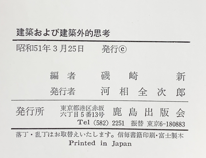 | 建築および建築外的思考 鹿島出版 編:磯崎新 | ||||