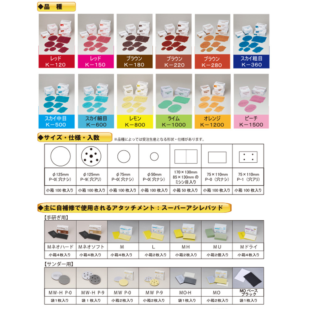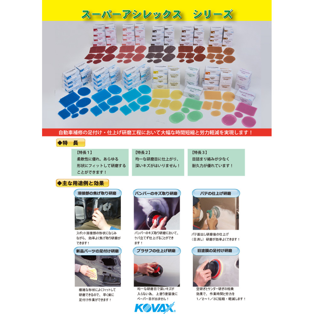 スーパーアシレックス・アシレックス シリーズは従来の研磨布紙とは違った製法でつくられた全く新しい研磨材であり、従来の研磨布紙や不織布研磨材と比較して、特に下記点において著しく優れた効果を発揮します。