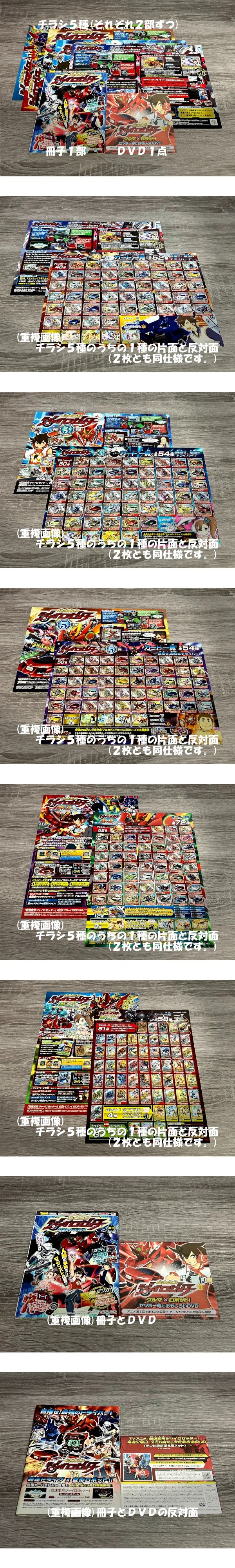 | ------------------------------------------------------------------------ ж ж ж 商品について ж ж ж ------------------------------------------------------------------------ ◆ 「 超速変形ジャイロゼッター 配布品 」 チラシは 同じものが2枚ずつで合計10枚です。ごく一部です。コンプなどではありません。 店舗で吊り下げられていたときの穴、及び 引き抜いた際のやぶれた跡があります。 DVDは未開封の為、動作未確認。動作保証なし。 いずれも スレ、シワ、折れ、などがあります。 いずれも 入手より かなり経年しており、記載以外にも 初期、経年 による劣化、及び 保管時、取り扱い時などのダメージ必至です。 ※ 商品は この下の画像1枚目のもので全てです。 ※ 自身が 当時 新品で入手した ワンオーナー品です。 ※ 画像は 実物よりきれいに写ってしまう部分があります。 また、最初の検品・出品から 時間が経っているものは、掲載画像・説明にはない 劣化 及び ダメージの増加 など 必至です。商品状態は現物優先です。 ※ ペットなし、非喫煙環境です。 |