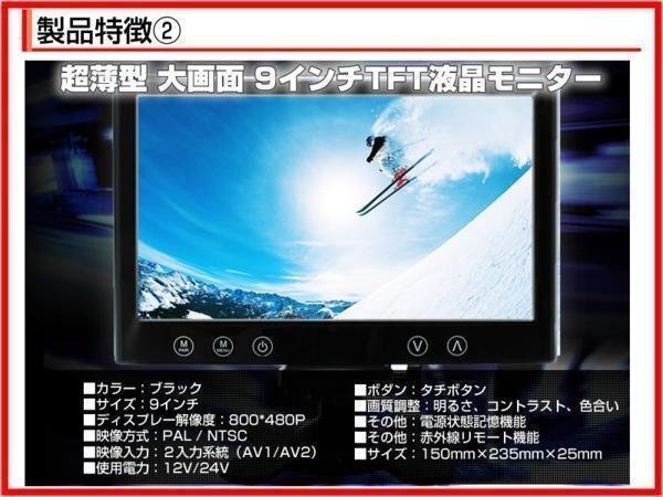 | 液晶サイズ:9インチ 画素数:800×480 消費電力:6W 映像入力端子:RCA2系統 映像入力切替機能:1系統のみバックギア連動可能 定格電圧:DC12V / DC24V 本体サイズ:横235mm × 高さ175mm × 奥行26mm |