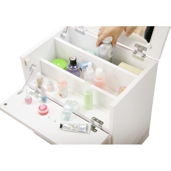 | サイズ | 全体:幅45x奥行32.5x高さ53cm 引出上段:幅38×奥行16×高さ12.5cm 引出下段:幅38×奥行24×高さ12cm 上部スペース:幅41×奥行24×高さ14cm 鏡を立ち上げた際の最大高さ:82.5cm |