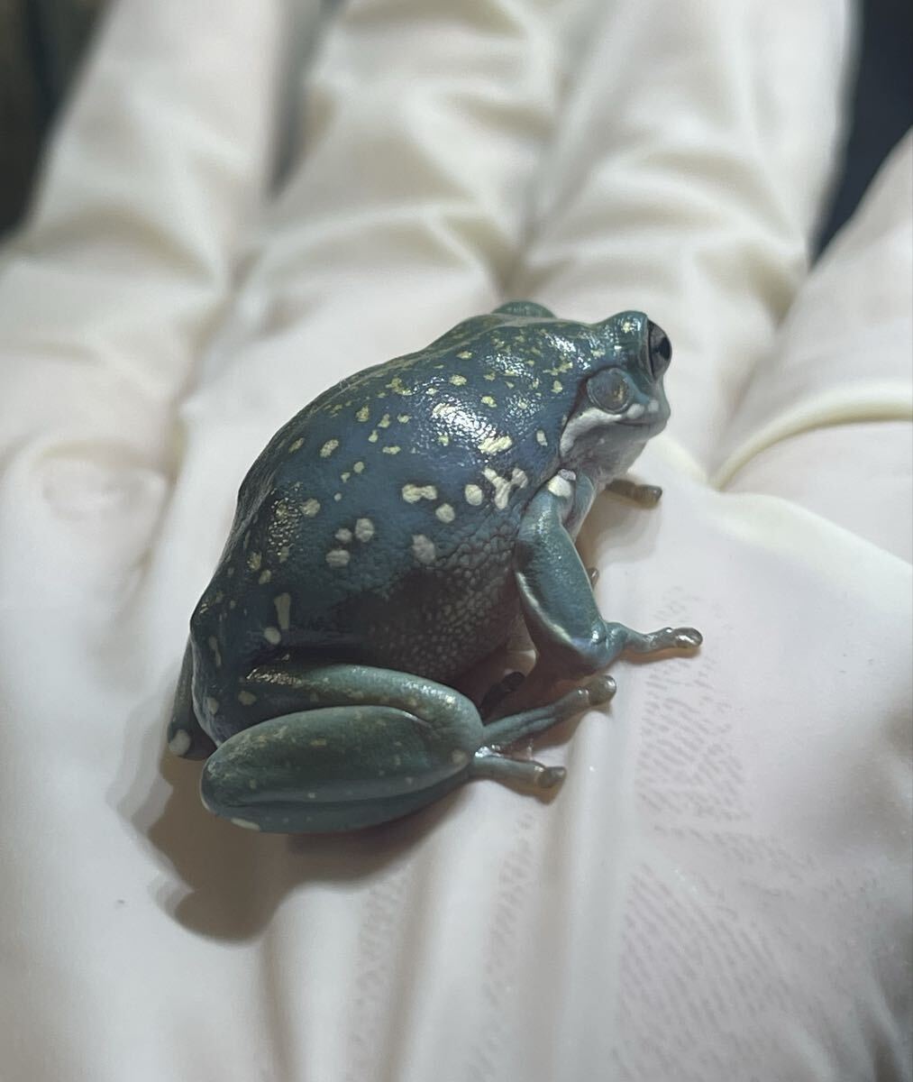 繁殖個体ブルーのイエアメガエルスノーフレークです。成長とともに青色が濃くなる個体です。サイズは3cm+です。餌はイエコを与えております。保温して発送しますが生き物ですので死着保証は出来ません。よろしくお願い致します。
