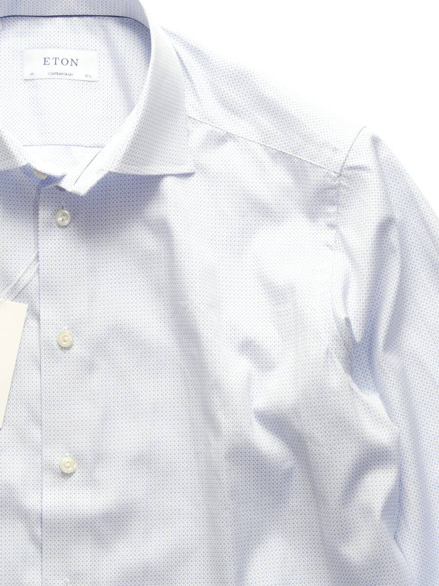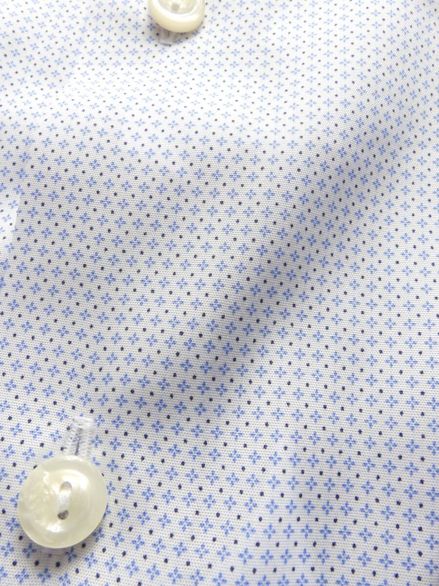 超長綿ピマコットン※の幾何学織り生地。織りの技術でナチュラルストレッチします。細番手超長コットン特有の生地ハリはもちろんですが、質の良さが見てわかる美しい生地艶、発色の良さが特徴です。これほど質の良いシャツが4万円ほどで購入できるのですから、やはりイートンのシャツは格別と思います。完全にハイブランド系最高級クラスのクオリティーです。