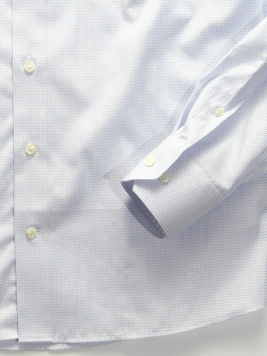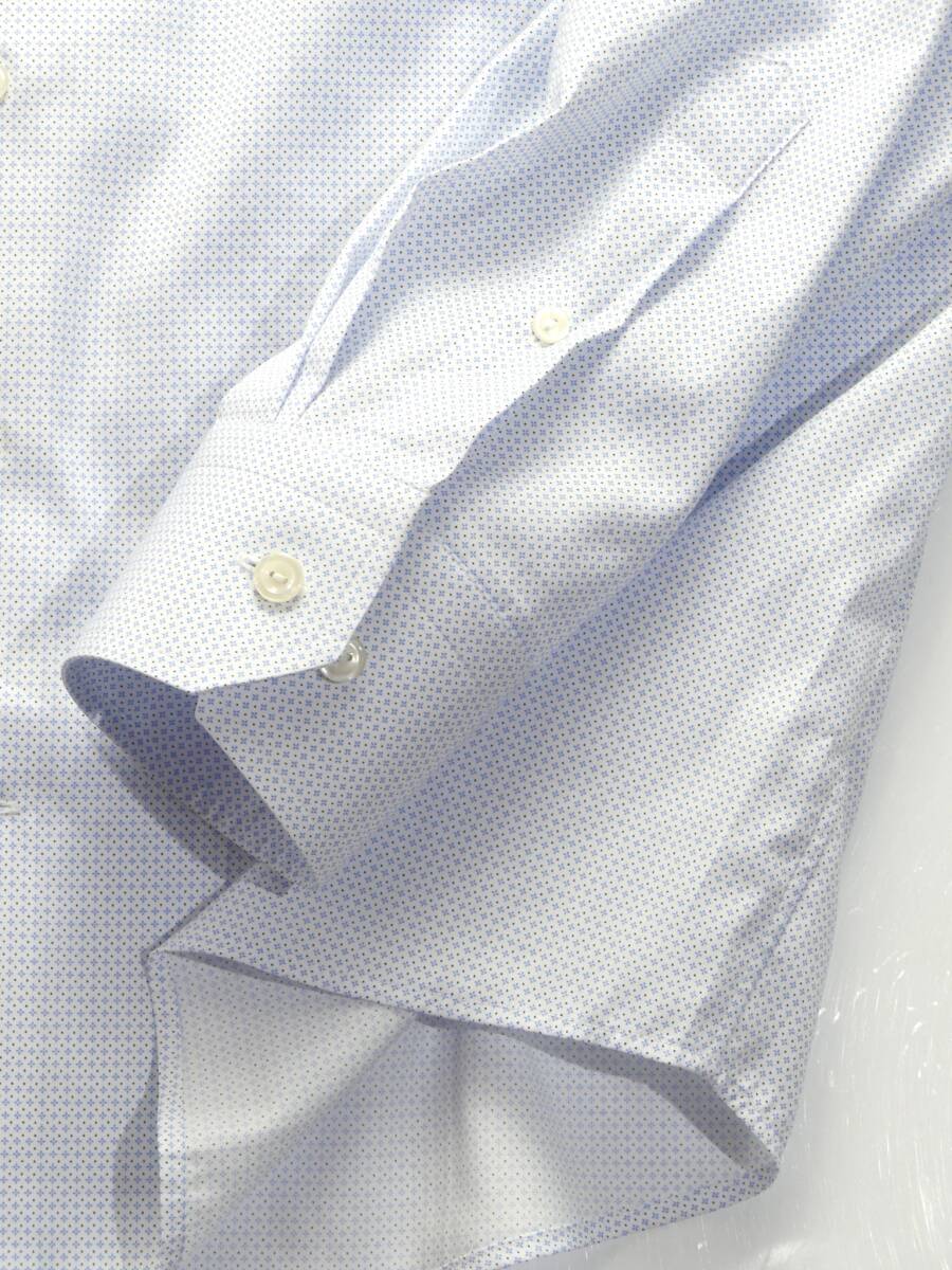 今回出品のシャツは「スリムスタイル」。ゆったりしたナチュラルフィットのコンテンポラリーフィットと比べて、胸一周で6cm、ウエスト一周で9cm細身に作られています。一般的なスリムフィットタイプで、フィットしない程度に無駄なダボツキをそぎ落とした現代モダンなスタイリッシュシャツ。ビジネスシーンはもちろんオフシーンでもご着用いただけるモダンシャツです。ダブルボタン仕様の袖口カフはボタンホール両切りになっていますので、お好みでカフスボタンもご使用可能です。