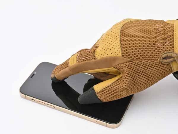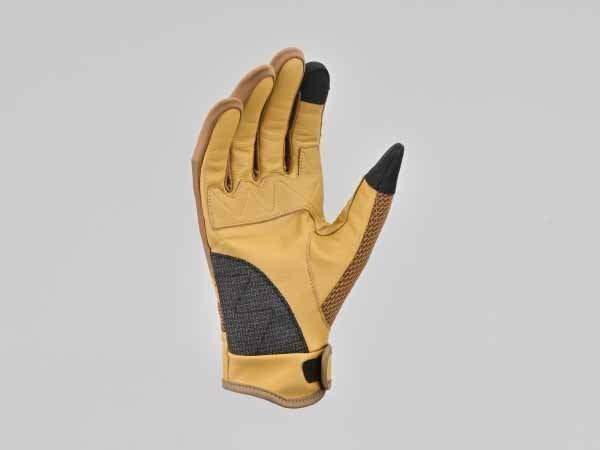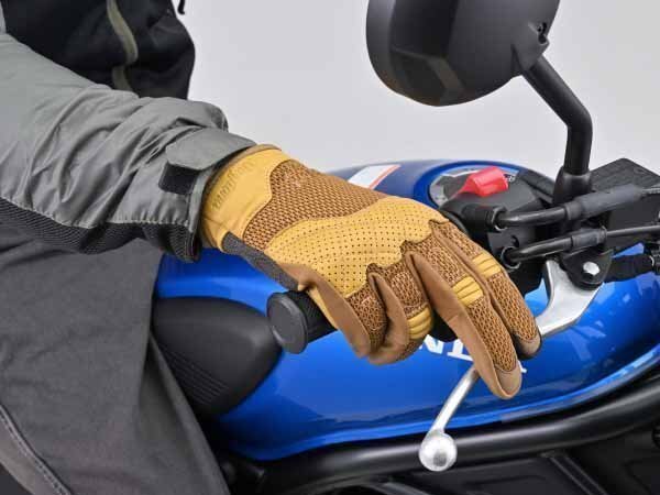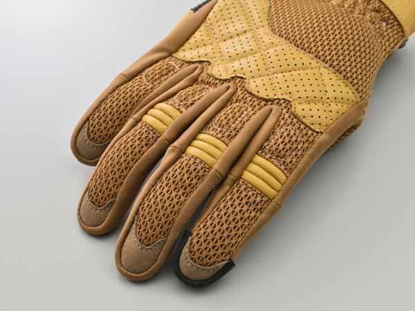 メッシュ生地に、手の甲から小指と手の平には通気性に優れるパンチングレザーを組み合わせ、