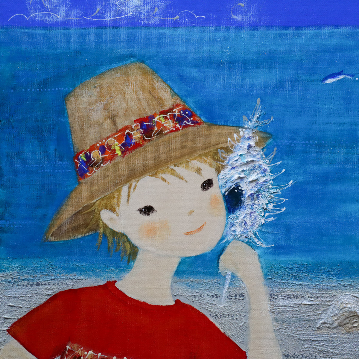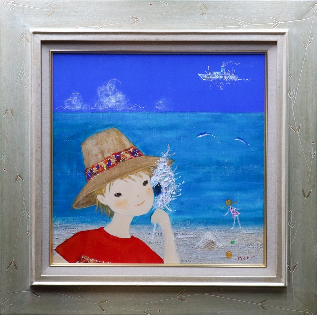 【宙】真作保証 前田麻里「海の詩」油彩 S6号 サイン裏書有 額装 砂浜で貝殻を耳に当てる少女と青空の夏景色 人気作家 [D]10D37.jl.F [浏览原始页面]