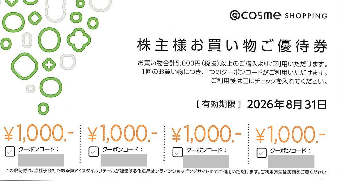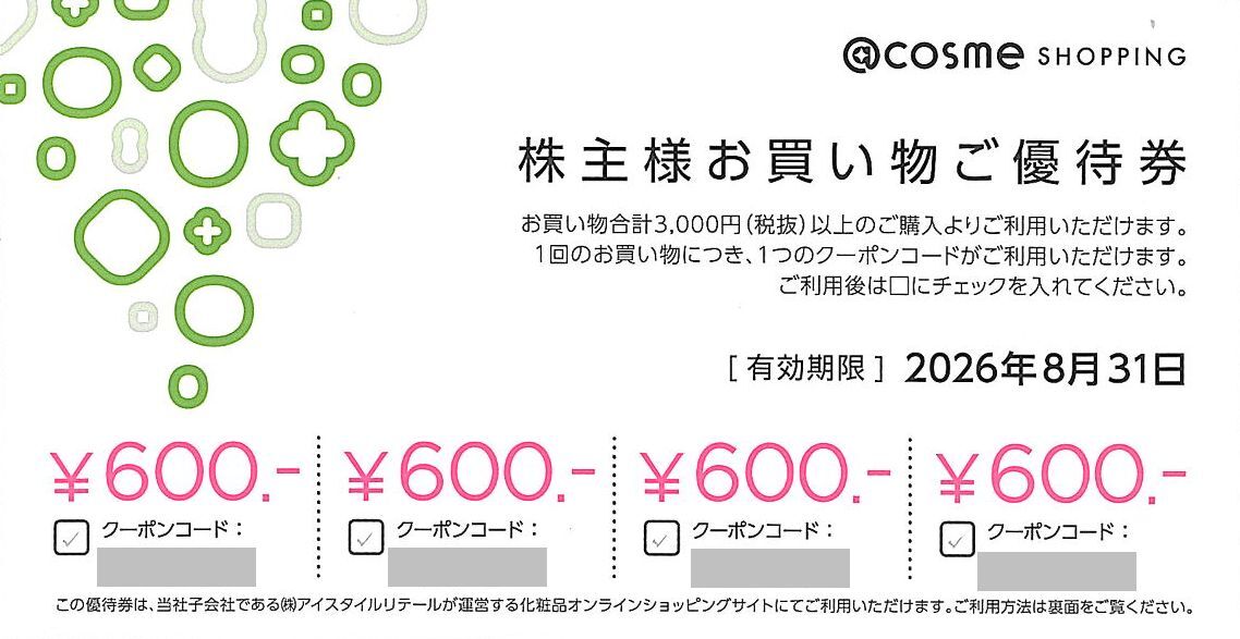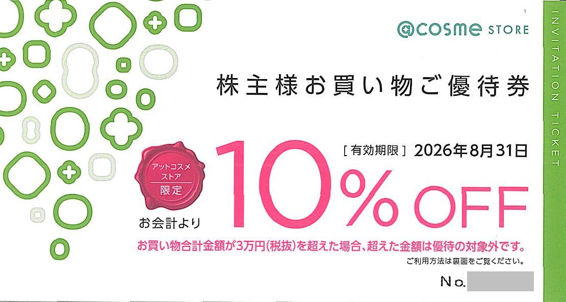 有効期限は「2026年8月31日」です。 アットコスメストア(店舗)でご利用可能な10%OFF券1枚と、アットコスメショッピング(オンライン)でご利用可能な合計6,400円分のクーポン券のセットです。 店舗用の10%OFF券は、お買物合計3万円(税抜)までが対象です。 オンライン用のクーポンは、1回のお買物につき1つのクーポンコードがご利用いただけます。 ※詳細につきましては、画像やホームページの株主優待をご覧ください。 |