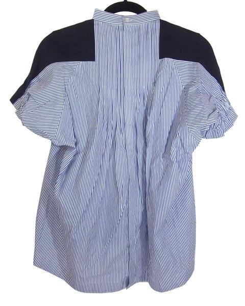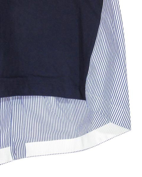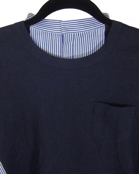 | サカイらしいオシャレなデザインのトップス。前身頃部分はTシャツ生地後身頃部分はシャツ生地になります。スカートにもパンツにもあわせて頂けてビジネスシーンからオフの日までお使い頂けます。 |