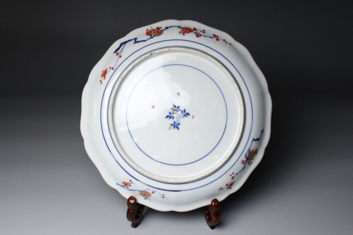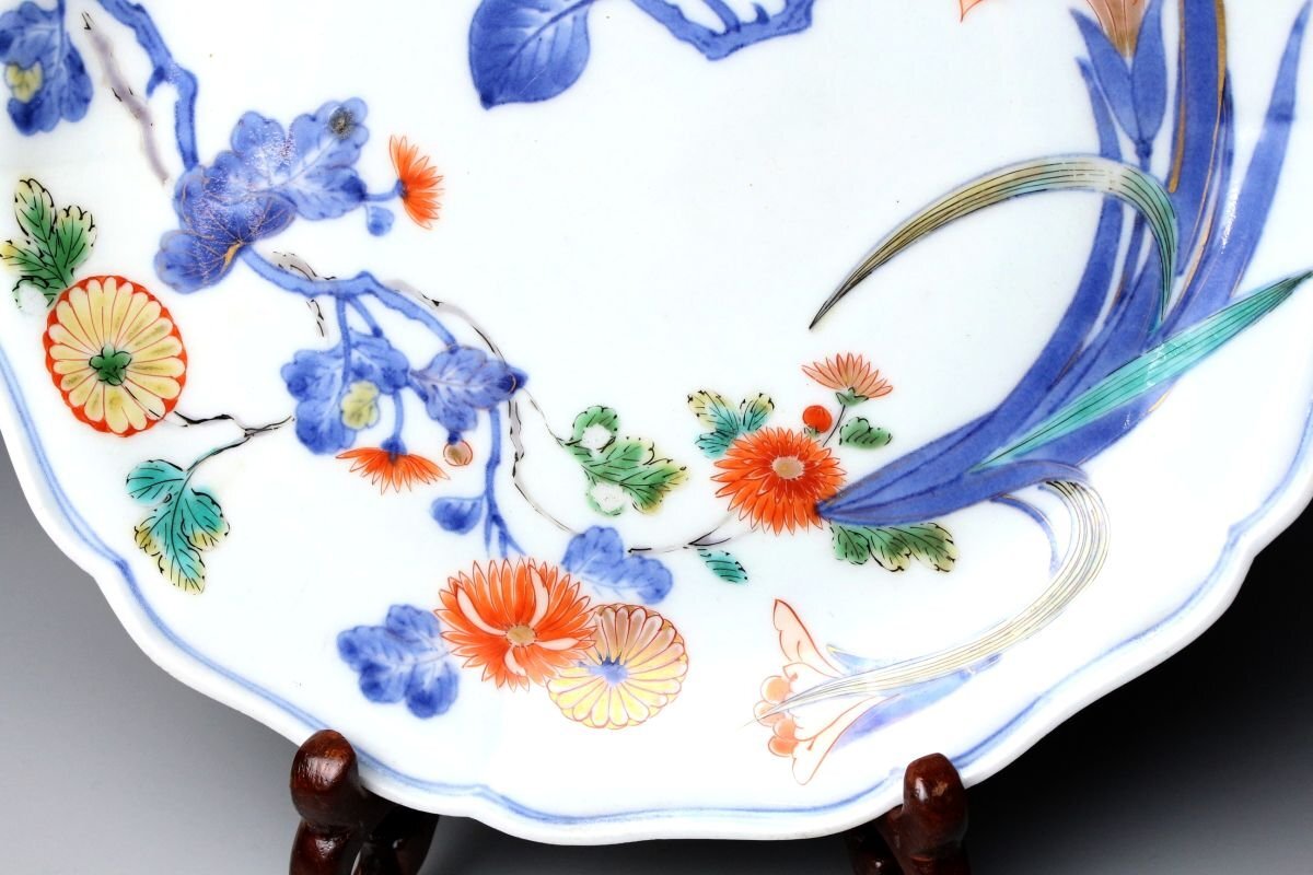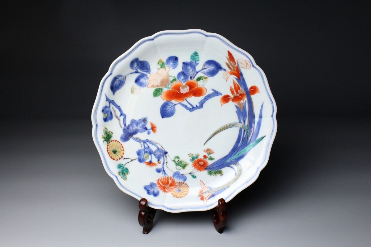 [.WR]25.11 25110530T* * * 商品詳細 * * * ここでしか出逢うことのできない唯一の美をご紹介させて頂きます。 元禄期の華やかさを伝える逸品、伊万里焼の輪花皿。 色絵で丁寧に描かれた菊と牡丹、その他の花文は、鮮やかでありながらも上品な風格を漂わせ、 金彩が華麗なアクセントとして輝きます。 輪花の繊細な形状が光を受けて陰影を作り、絵付の美しさを一層際立たせています。 時代を経た風格と華やぎが同居する、まさに元禄伊万里ならではの逸品。 茶席や飾り皿としても、目を引く存在感を放つ、格調高い一枚です。 ■商品内容/ 皿、箱 ■サイズ/横22㎝×高2.5㎝ 箱:横24㎝×高7㎝×奥行7㎝ ■状態/経年による スレ、小傷、汚れ、剥がれ、窯被 箱にスレ、傷、汚れがございます。 ※皿立ては付属致しません。 ※写真にてご確認、ご了承の上ご入札下さい。