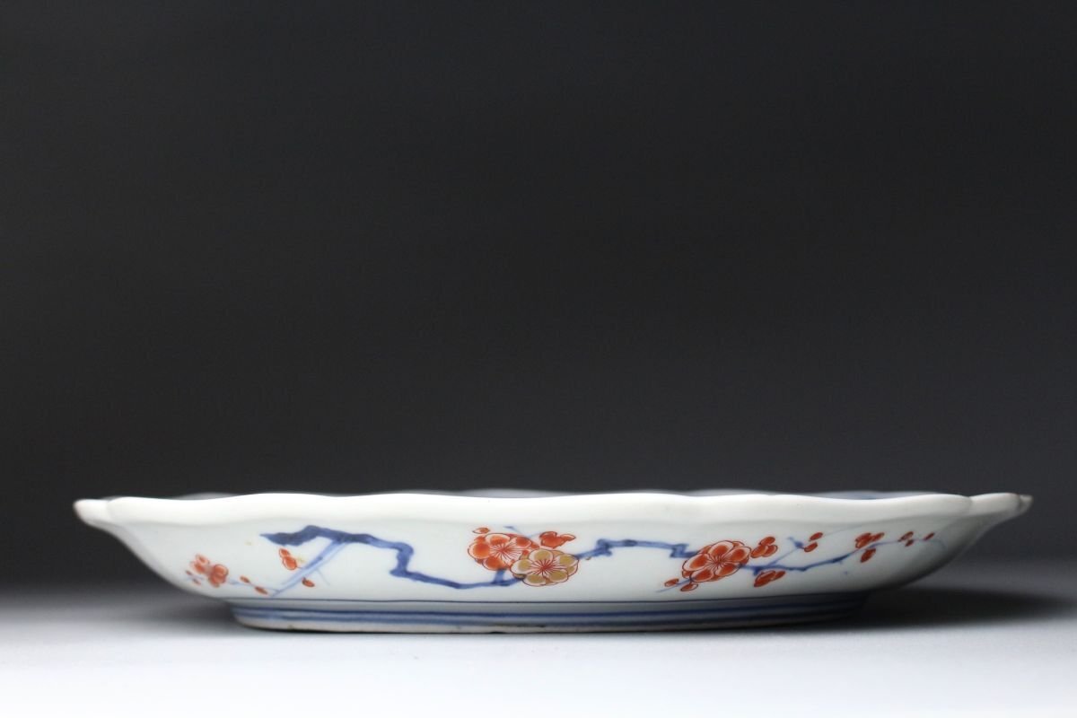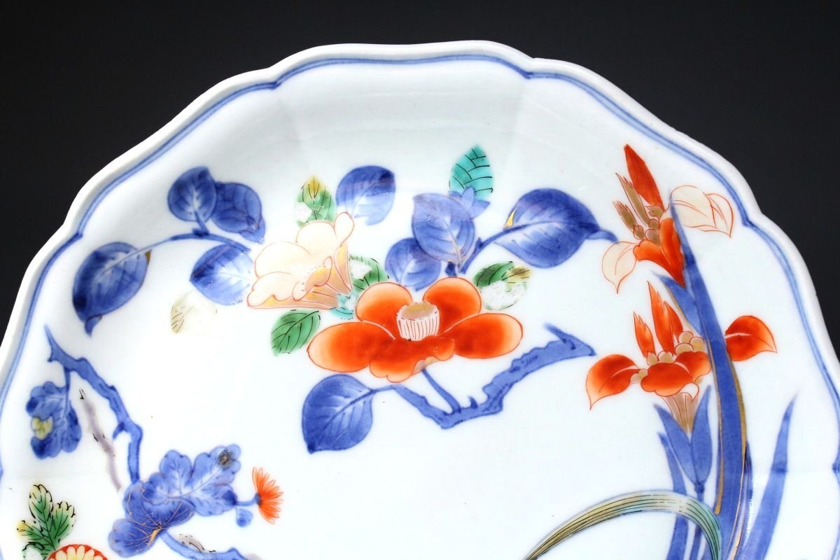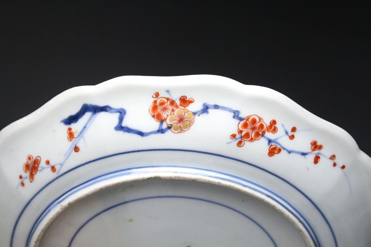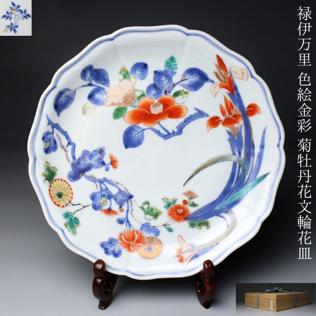 [.WR]25.11 25110530T* * * 商品詳細 * * * ここでしか出逢うことのできない唯一の美をご紹介させて頂きます。 元禄期の華やかさを伝える逸品、伊万里焼の輪花皿。 色絵で丁寧に描かれた菊と牡丹、その他の花文は、鮮やかでありながらも上品な風格を漂わせ、 金彩が華麗なアクセントとして輝きます。 輪花の繊細な形状が光を受けて陰影を作り、絵付の美しさを一層際立たせています。 時代を経た風格と華やぎが同居する、まさに元禄伊万里ならではの逸品。 茶席や飾り皿としても、目を引く存在感を放つ、格調高い一枚です。 ■商品内容/ 皿、箱 ■サイズ/横22㎝×高2.5㎝ 箱:横24㎝×高7㎝×奥行7㎝ ■状態/経年による スレ、小傷、汚れ、剥がれ、窯被 箱にスレ、傷、汚れがございます。 ※皿立ては付属致しません。 ※写真にてご確認、ご了承の上ご入札下さい。