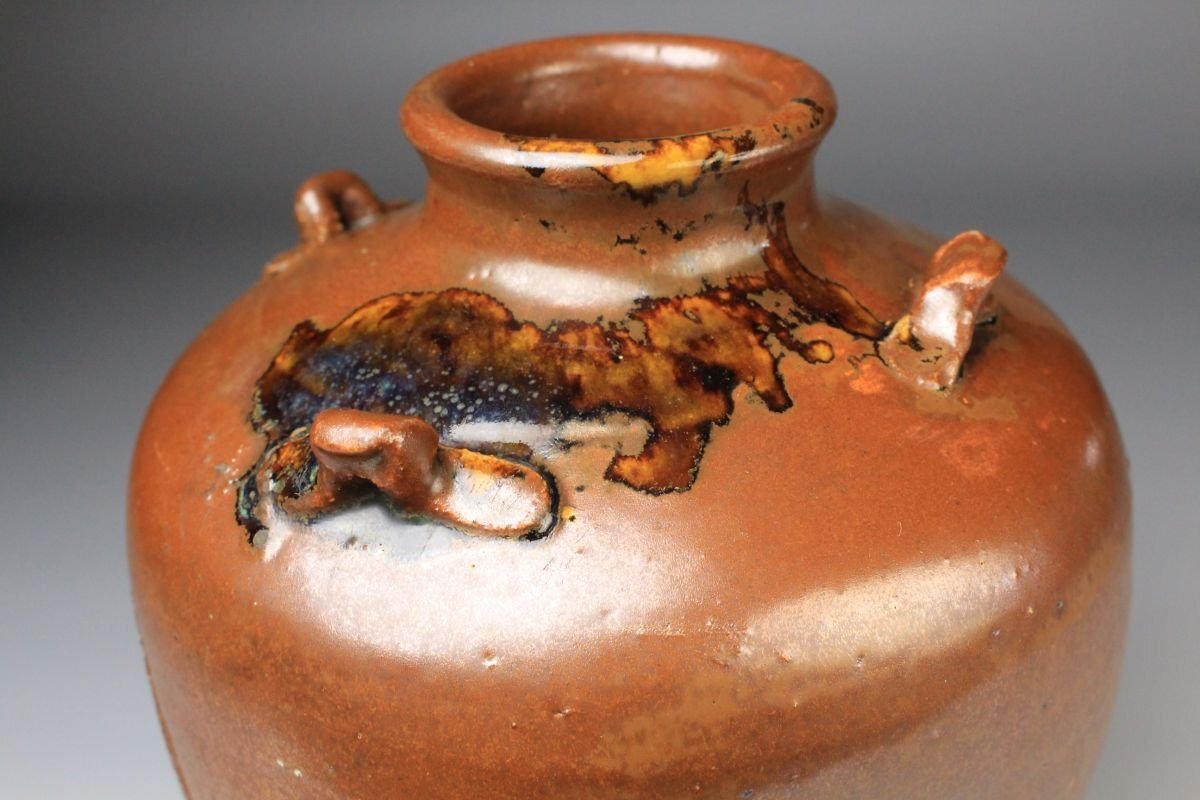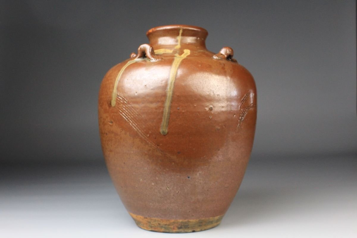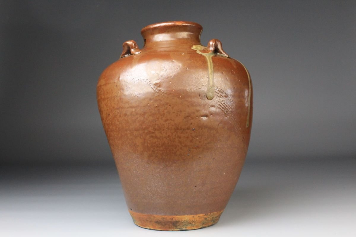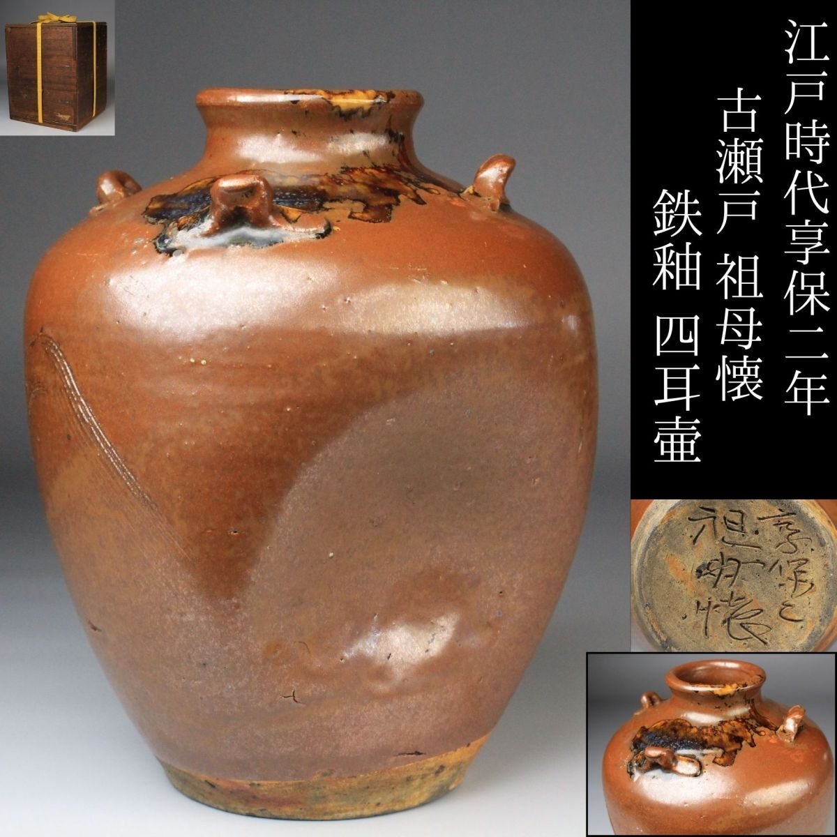 [.Y]25.09 25091409 T* * * 商品詳細 * * * ここでしか出逢うことのできない唯一の美をご紹介させて頂きます。 こちらは、江戸時代・享保二年 古瀬戸 祖母懐 鉄釉 四耳壷でございます。 堂々とした祖母懐形の胴に、四耳を備えた重厚な造形。柿色とよる深みある黒が混じり合い、窯変の妙が織りなす景色はまさに古瀬戸ならではの渋美を感じさせます。 さらに本作の底面には、享保二年の年号が彫り込まれており江戸中期の陶磁史を語る上でも重要な位置を占める作品といえるでしょう。 四耳の造形は実用性を備えると同時に、器全体に荘重な趣を与えています。鉄釉の黒と柿色の対比が力強さと温かみを同時に生み出し、古瀬戸の真髄を伝える格調高い壷として、鑑賞においても優れた存在感を放ちます。 ■商品内容/ 壷、箱 ■サイズ/横15.5㎝×高22㎝ 箱:横22㎝×高27.5㎝×奥行21.5㎝ ■状態/ スレ、傷、汚れ、箱にスレ、傷、汚れ、パーツの外れ、経年による痛み、蓋の浮き、底に直し、ヒビがございます。 ※写真にてご確認、ご了承の上ご入札下さい。