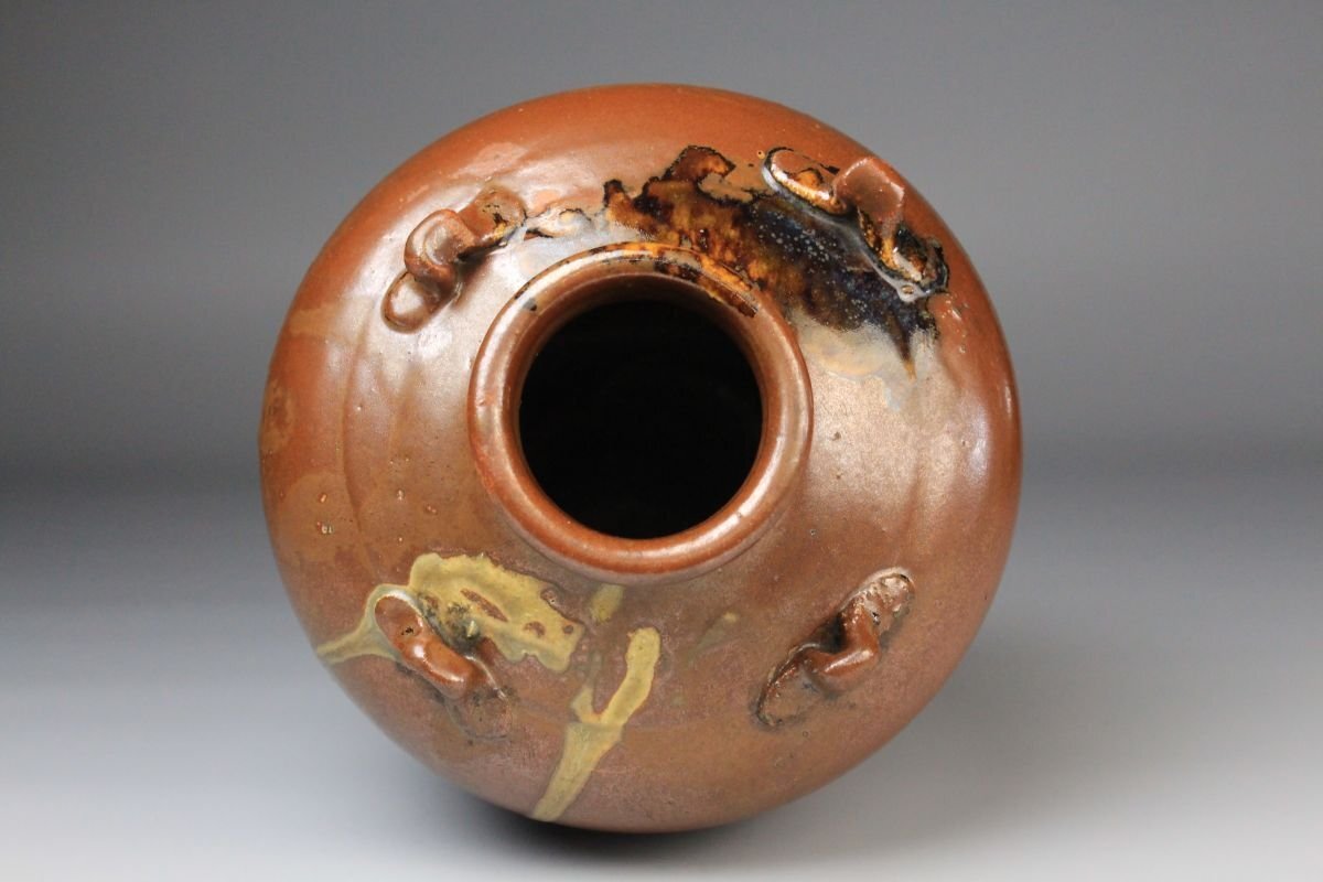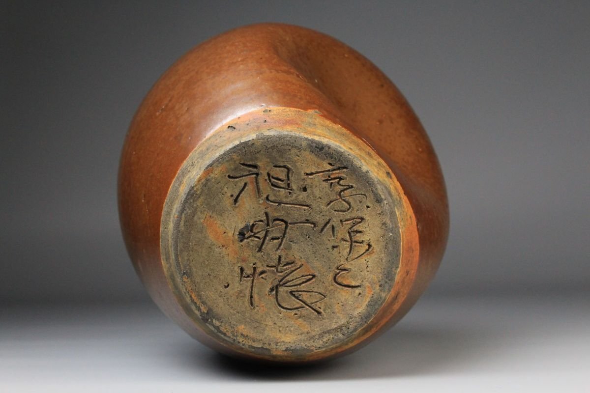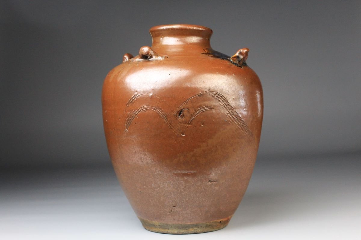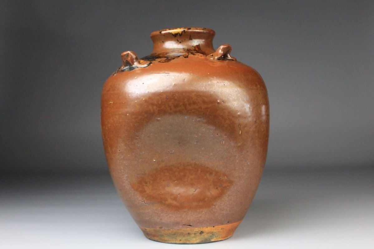 [.Y]25.09 25091409 T* * * 商品詳細 * * * ここでしか出逢うことのできない唯一の美をご紹介させて頂きます。 こちらは、江戸時代・享保二年 古瀬戸 祖母懐 鉄釉 四耳壷でございます。 堂々とした祖母懐形の胴に、四耳を備えた重厚な造形。柿色とよる深みある黒が混じり合い、窯変の妙が織りなす景色はまさに古瀬戸ならではの渋美を感じさせます。 さらに本作の底面には、享保二年の年号が彫り込まれており江戸中期の陶磁史を語る上でも重要な位置を占める作品といえるでしょう。 四耳の造形は実用性を備えると同時に、器全体に荘重な趣を与えています。鉄釉の黒と柿色の対比が力強さと温かみを同時に生み出し、古瀬戸の真髄を伝える格調高い壷として、鑑賞においても優れた存在感を放ちます。 ■商品内容/ 壷、箱 ■サイズ/横15.5㎝×高22㎝ 箱:横22㎝×高27.5㎝×奥行21.5㎝ ■状態/ スレ、傷、汚れ、箱にスレ、傷、汚れ、パーツの外れ、経年による痛み、蓋の浮き、底に直し、ヒビがございます。 ※写真にてご確認、ご了承の上ご入札下さい。