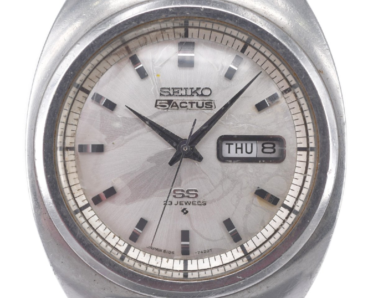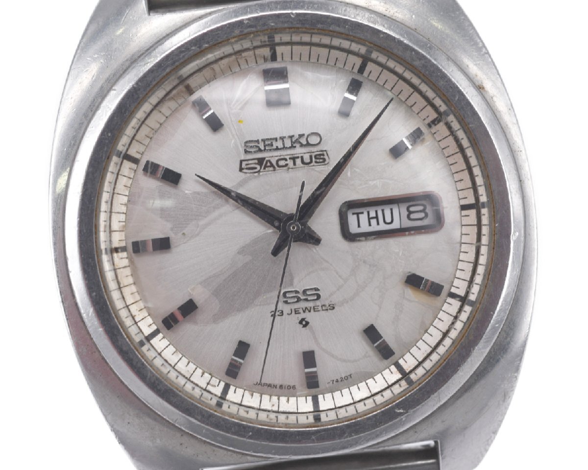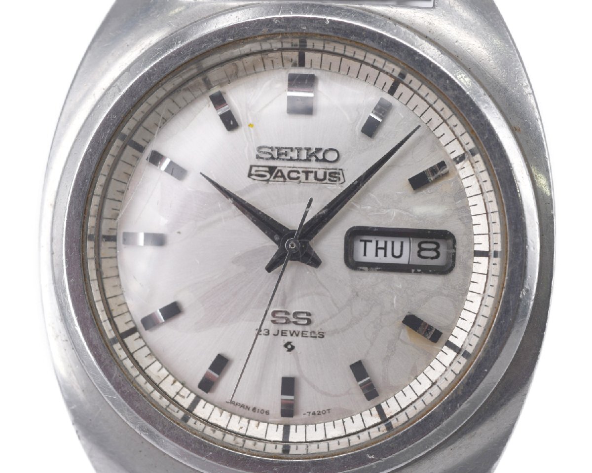 ナナハチヤは掘り出し物がいっぱいあります!! 【SEIKO】セイコー 5ACTUS セイコー5 アクタス 6106-7420 23石 デイデイト 自動巻 中古品のご案内です。 コンディションといたしましては、通常使用程度で使用感のある中古品でございます。 リューズ操作につきましては、時刻の調整など行うことができます。 カレンダー、曜日の切り替わりは確認できました。 カレンダーの早送りも確認できました。 商品入荷時より止まった状態で入荷いたしました動作未確認商品でございます。 メンテナンスが必要になるかと思いますが、メンテナンスして頂けましたらこれからもご使用いただけると思います。 ぜひ、ご検討くださいませ。 |