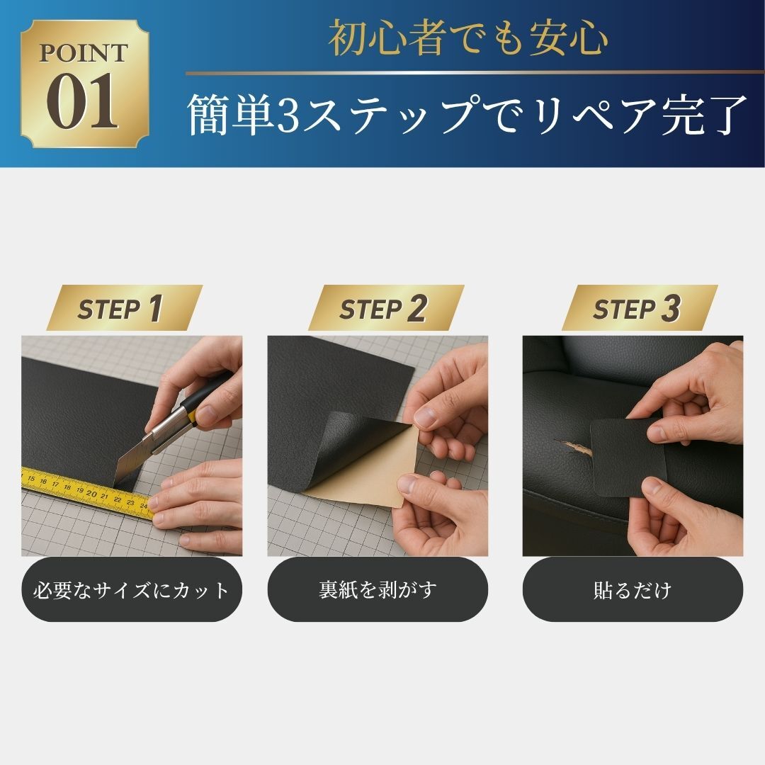 アイロンも接着剤も一切不要! 誰でも簡単に本格補修ができるレザーシートです。