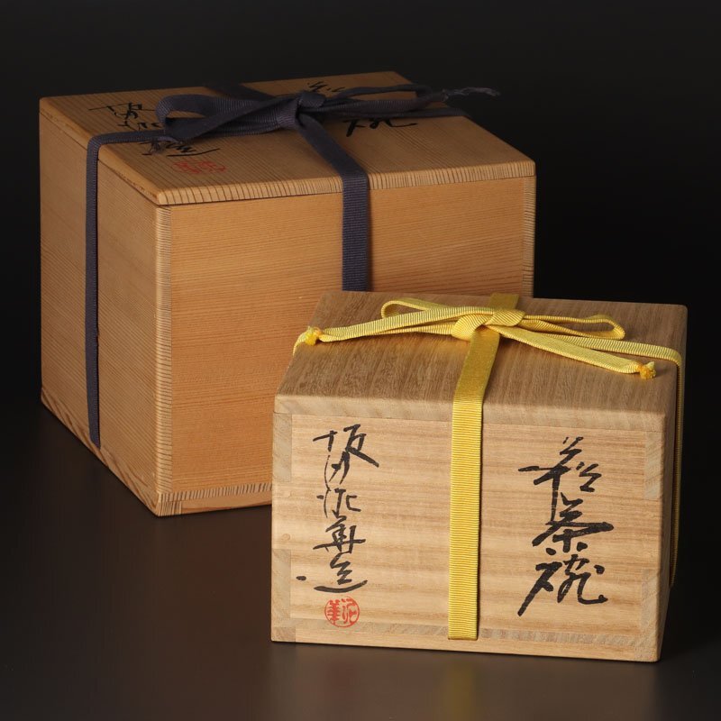 【十三代坂田泥華】 父に12代坂田泥華を持つ。地元の萩商高校を卒業後は家業に従事するが、戦時と重なり召集により出兵。戦後から本格的に父に作陶を学び、1950年に父の隠居に伴い13代坂田泥華を襲名。56年に現代陶芸展初入選(以降連続入選)、61年に日本伝統工芸展に初入選。64年には正会員に推挙され、76年には理事に就任している。そのほかに65年には山口県文化奨励賞、70年中国文化賞の受賞に続き、72年に山口県重要無形文化財の認定、81年紫綬褒章、87年に勲4等旭日小綬章を綬章している。作風は伝統的な萩焼の作風を継承する傍ら、独自の技法で豪放な作品の中に繊細さを表現している。特に泥華井戸と称される井戸茶碗が有名。平成22年2月24日95歳にて没す。 |
